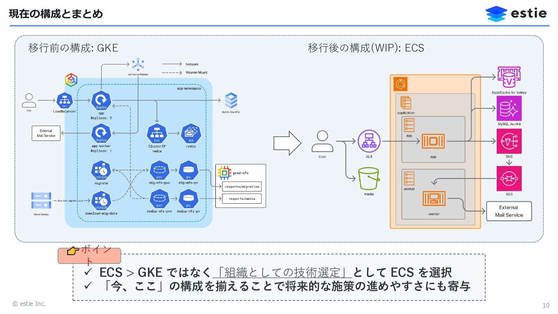 © estie Inc. 現在の構成とまとめ 10 移行前の構成: GKE 移行後の構成(WIP): ECS ✓
