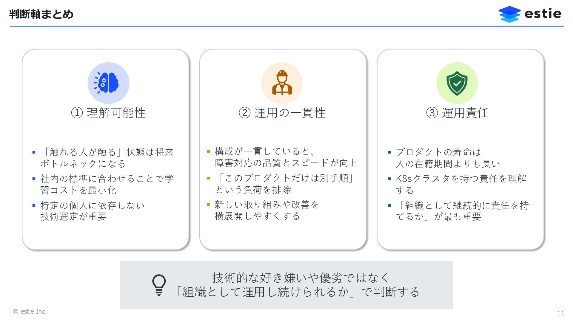 ▪ 社内の標準に合わせることで学 習コストを最小化 ▪ 特定の個人に依存しない 技術選定が重要 ② 運用の一貫性 ▪ 構成が一貫していると、 障害対応の品質とスピードが向上 ▪ 「このプロダクトだけは別手順」 という負荷を排除 ▪ 新しい取り組みや改善を 横展開しやすくする ③ 運用責任 ▪ プロダクトの寿命は 人の在籍期間よりも長い ▪ K8sクラスタを持つ責任を理解 する ▪ 「組織として継続的に責任を持 てるか」が最も重要 技術的な好き嫌いや優劣ではなく 「組織として運用し続けられるか」で判断する