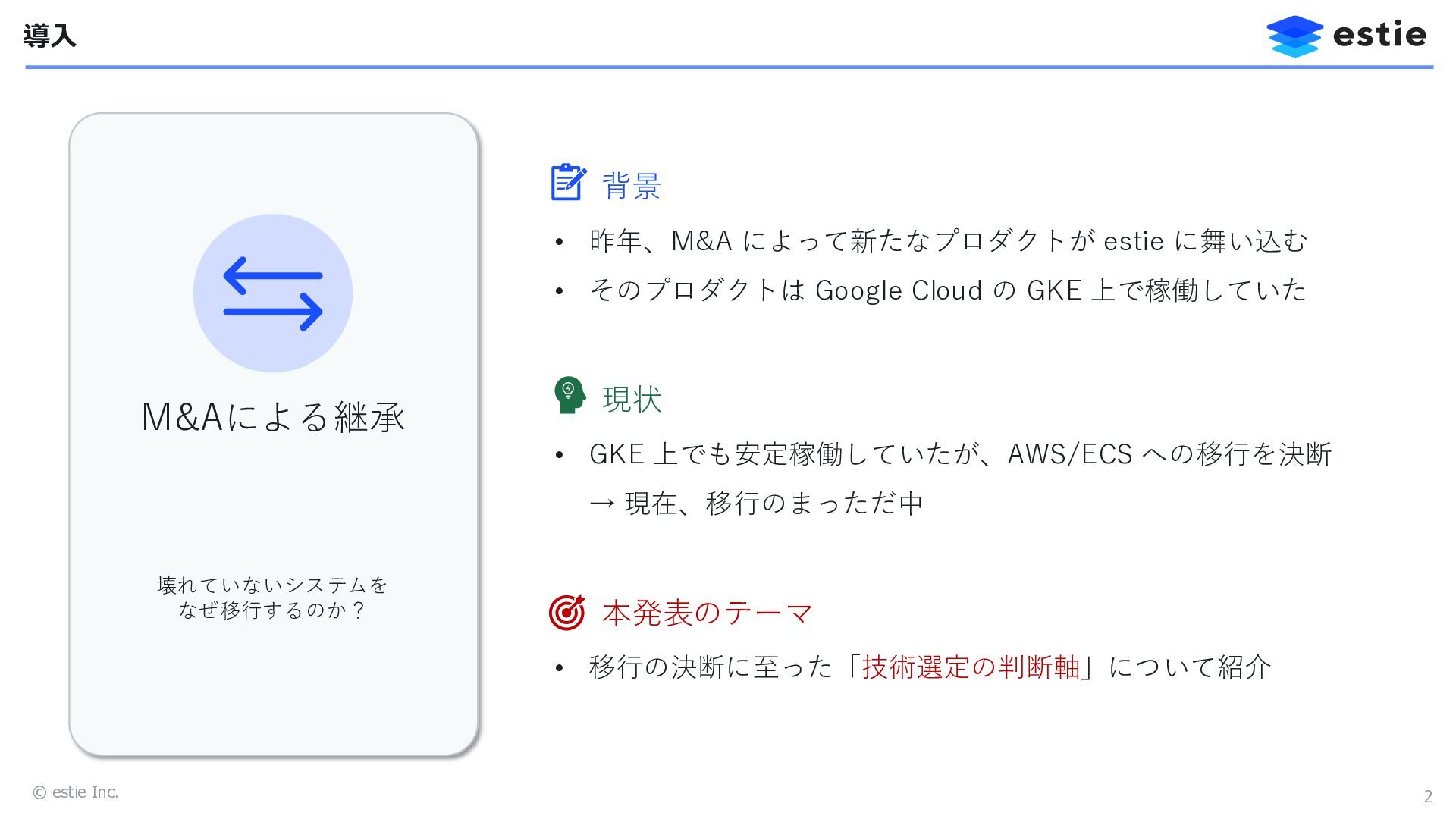 © estie Inc. 導入 2 背景 • 昨年、M&A によって新たなプロダクトが estie