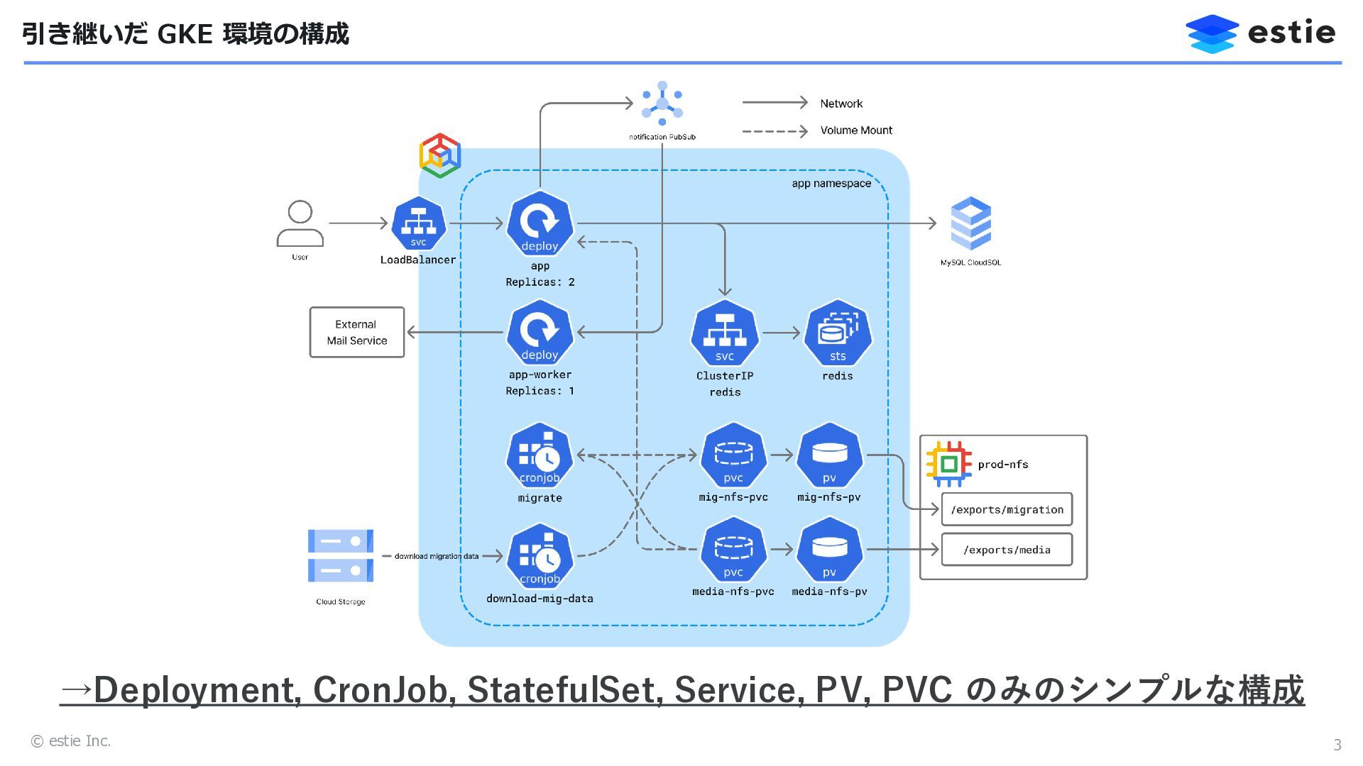 © estie Inc. 3 引き継いだ GKE 環境の構成 →Deployment, CronJob, StatefulSet,