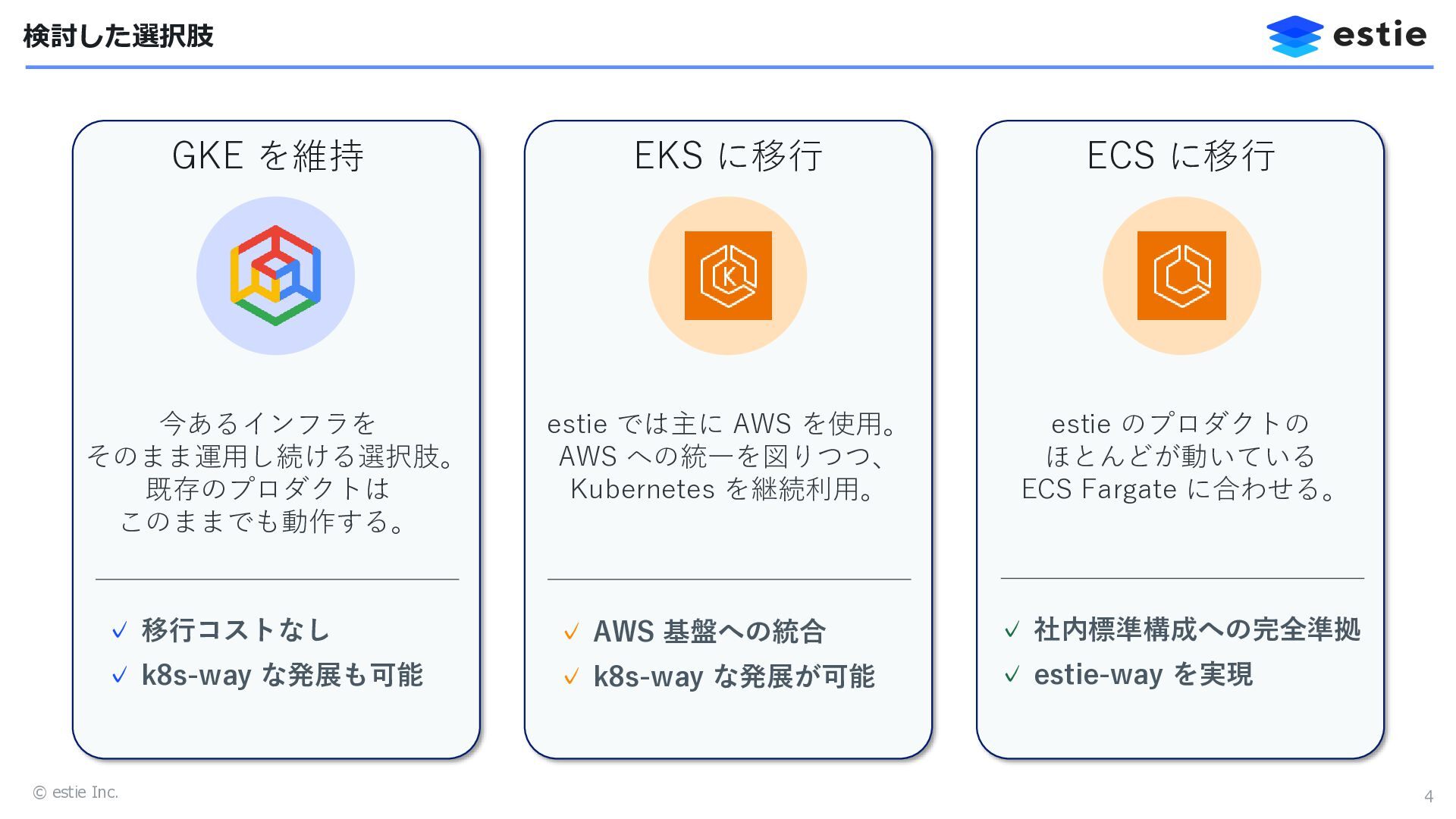 このままでも動作する。 EKS に移行 estie では主に AWS を使用。 AWS への統一を図りつつ、 Kubernetes を継続利用。 ECS に移行 estie のプロダクトの ほとんどが動いている ECS Fargate に合わせる。 ✓ 移行コストなし ✓ k8s-way な発展も可能 ✓ AWS 基盤への統合 ✓ k8s-way な発展が可能 ✓ 社内標準構成への完全準拠 ✓ estie-way を実現