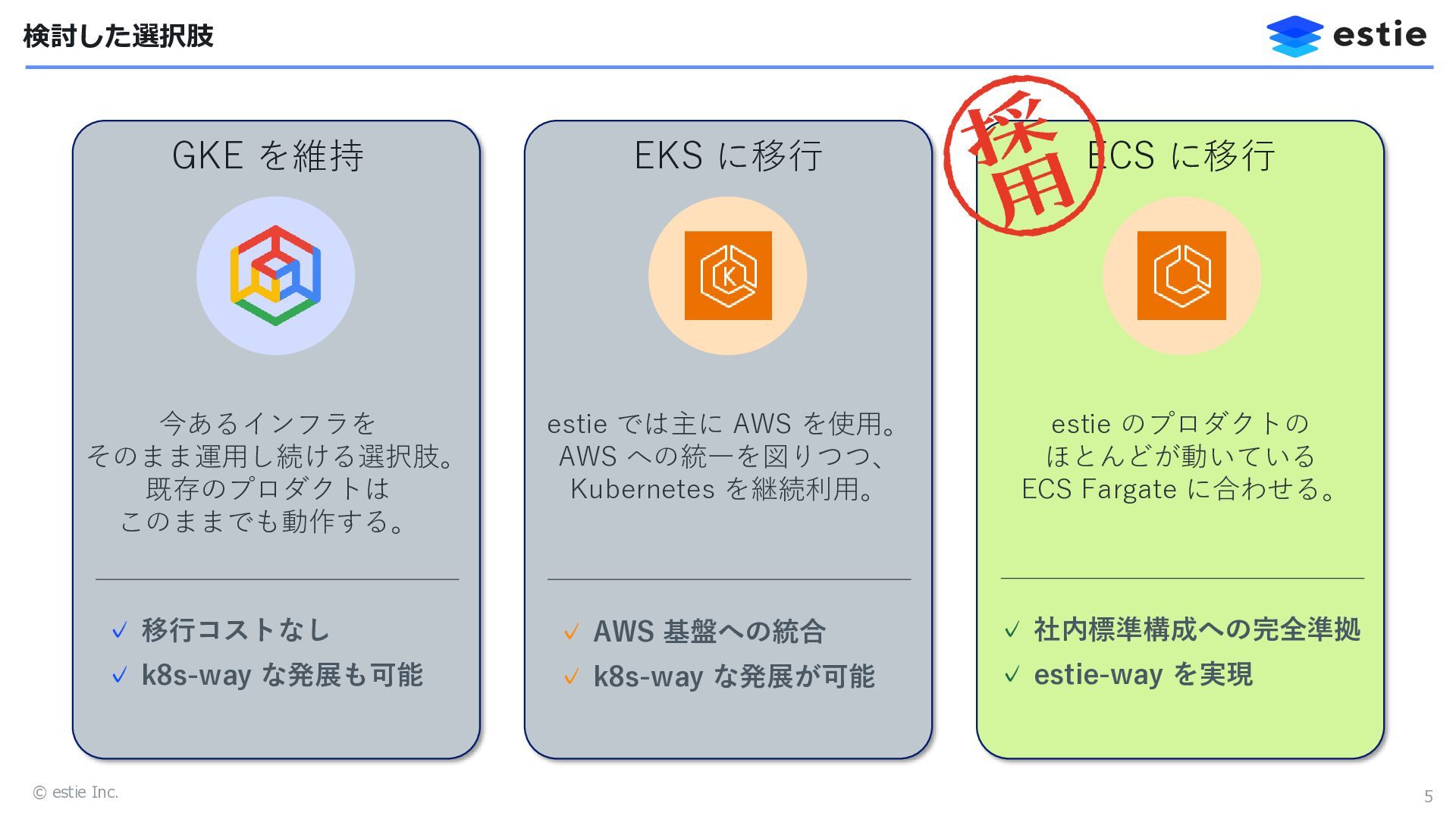 © estie Inc. 4 検討した選択肢 GKE を維持 今あるインフラを そのまま運用し続ける選択肢。 既存のプロダクトは