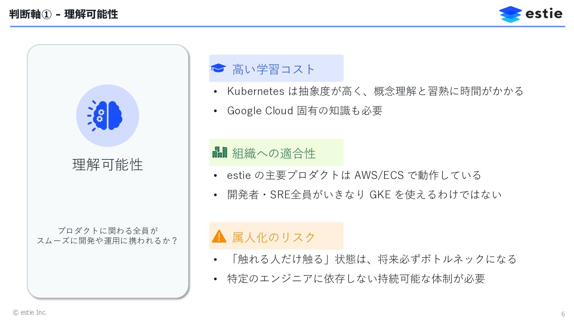 は抽象度が高く、概念理解と習熟に時間がかかる • Google Cloud 固有の知識も必要 組織への適合性 • estie の主要プロダクトは AWS/ECS で動作している • 開発者・SRE全員がいきなり GKE を使えるわけではない 属人化のリスク • 「触れる人だけ触る」状態は、将来必ずボトルネックになる • 特定のエンジニアに依存しない持続可能な体制が必要 理解可能性 プロダクトに関わる全員が スムーズに開発や運用に携われるか?