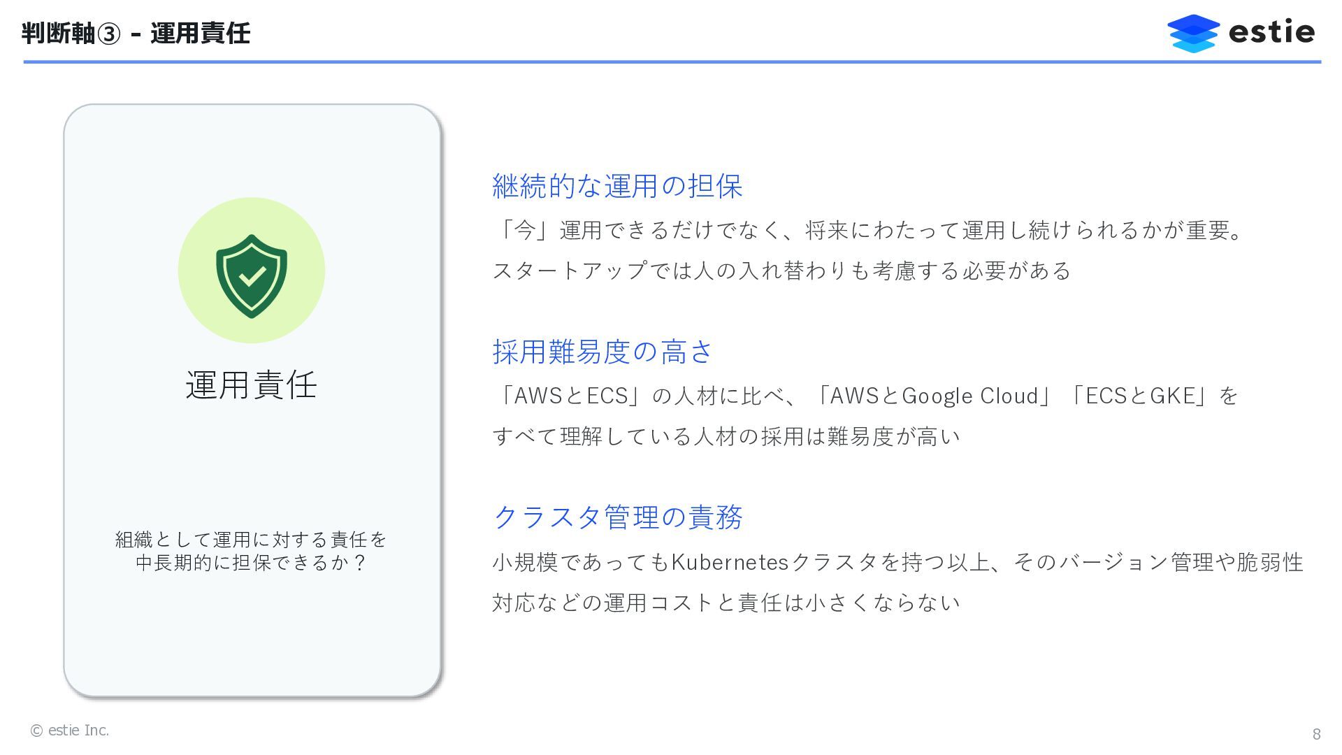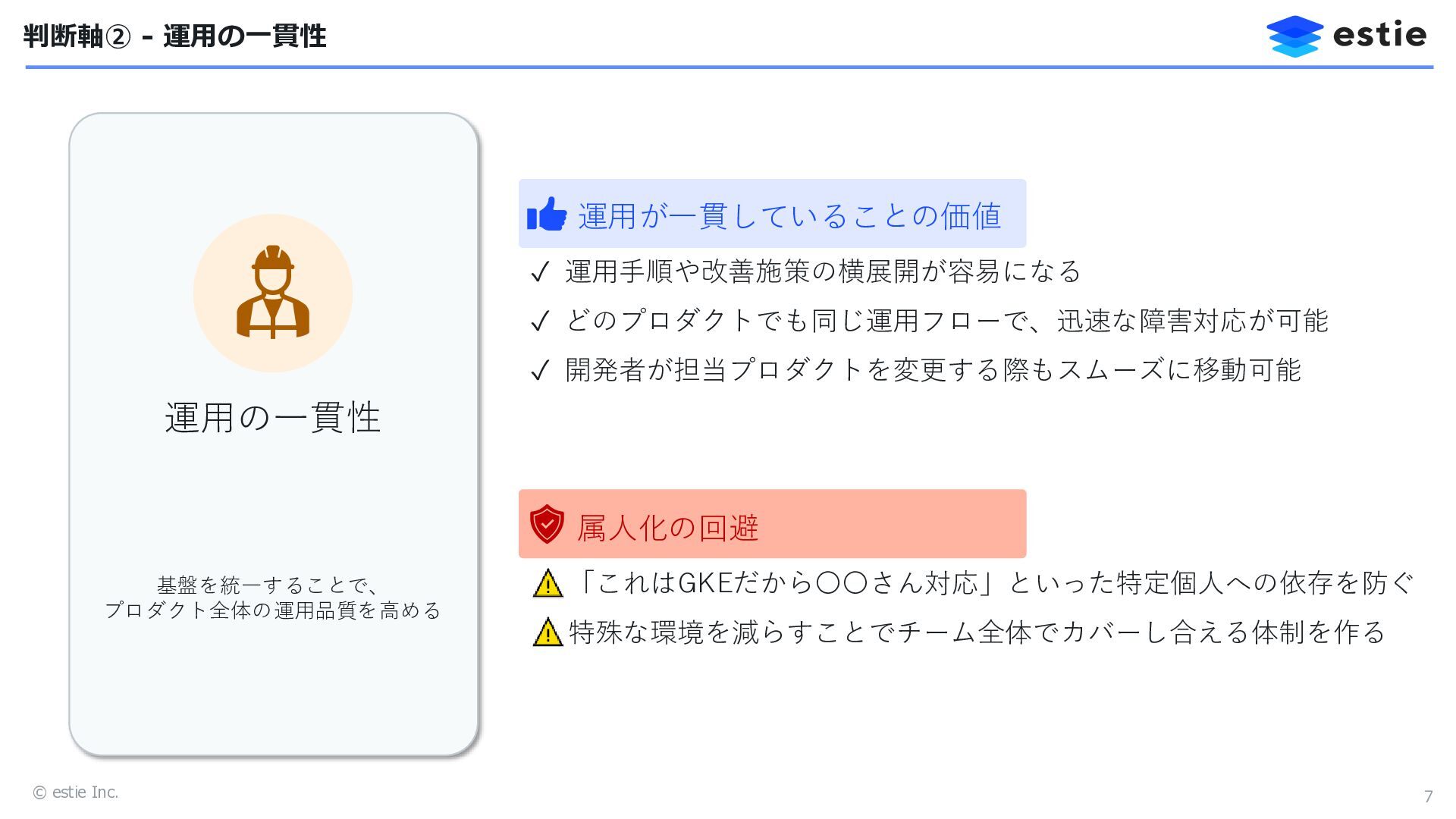 © estie Inc. 判断軸② - 運用の一貫性 7 運用が一貫していることの価値 ✓ 運用手順や改善施策の横展開が容易になる