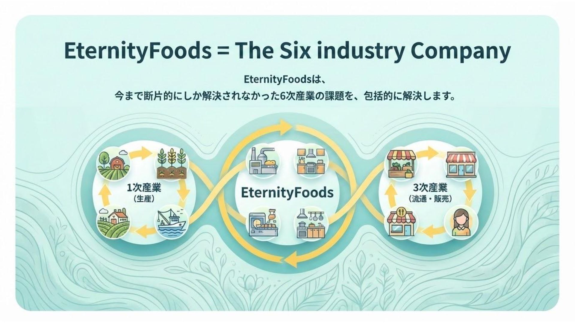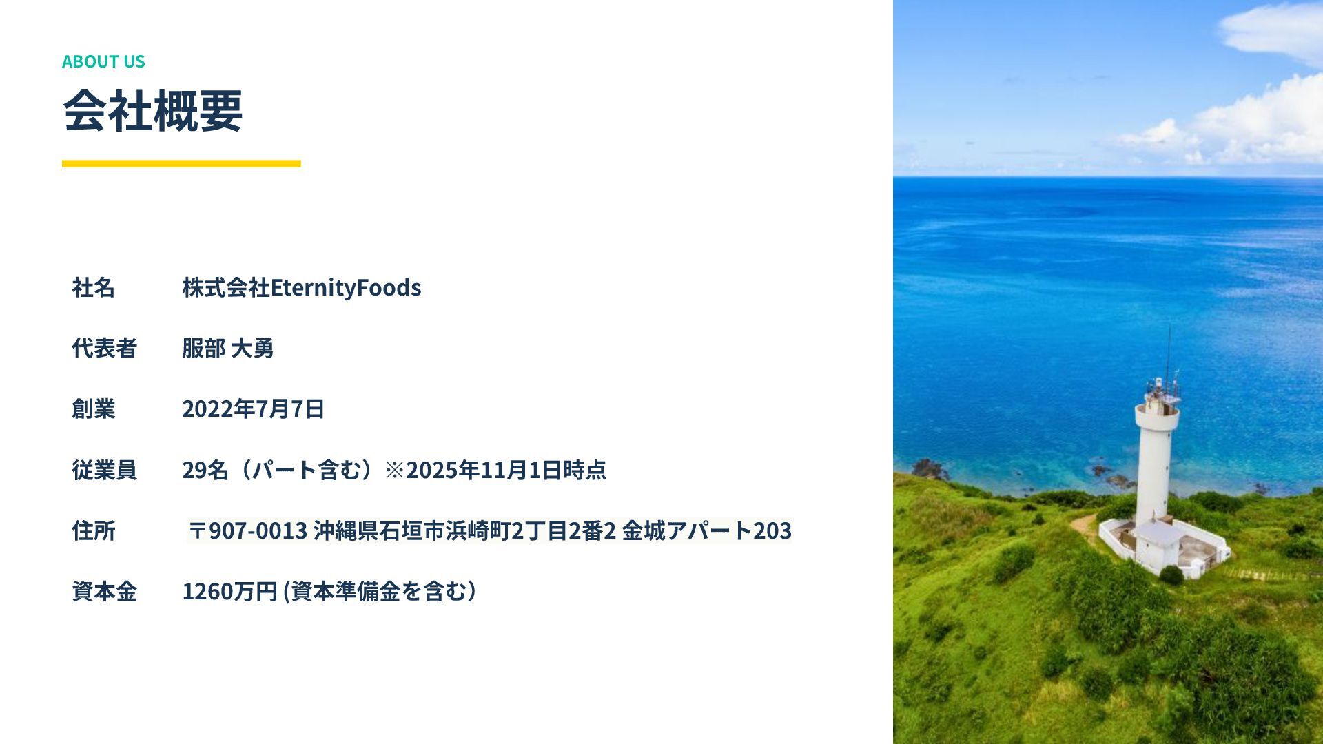 会社概要 ABOUT US 社名 株式会社EternityFoods 代表者 服部 ⼤勇 創業 2022年7⽉7⽇ 従業員 29名(パート含む)※2025年11⽉1⽇時点 住所 〒907-0013