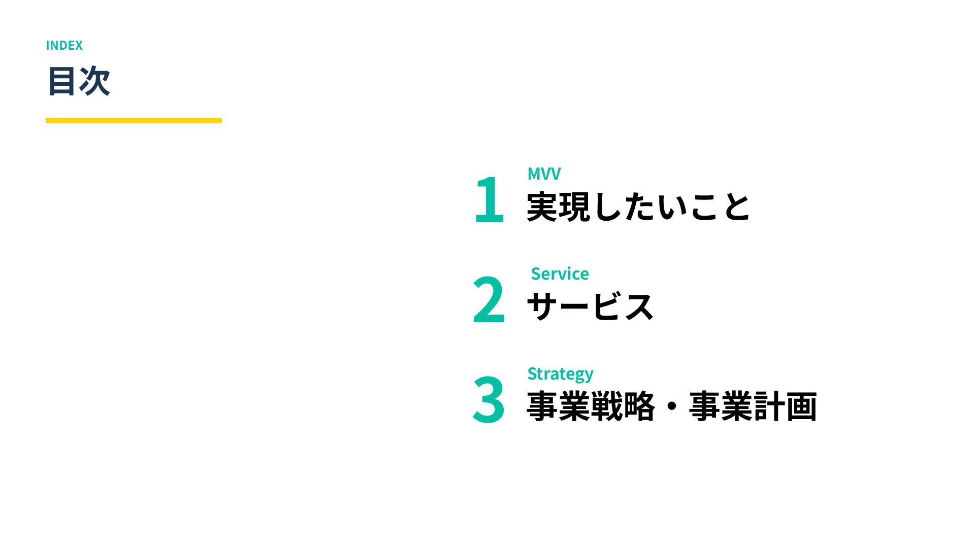 ⽬次 1 MVV INDEX 実現したいこと 2 Service サービス 3 Strategy