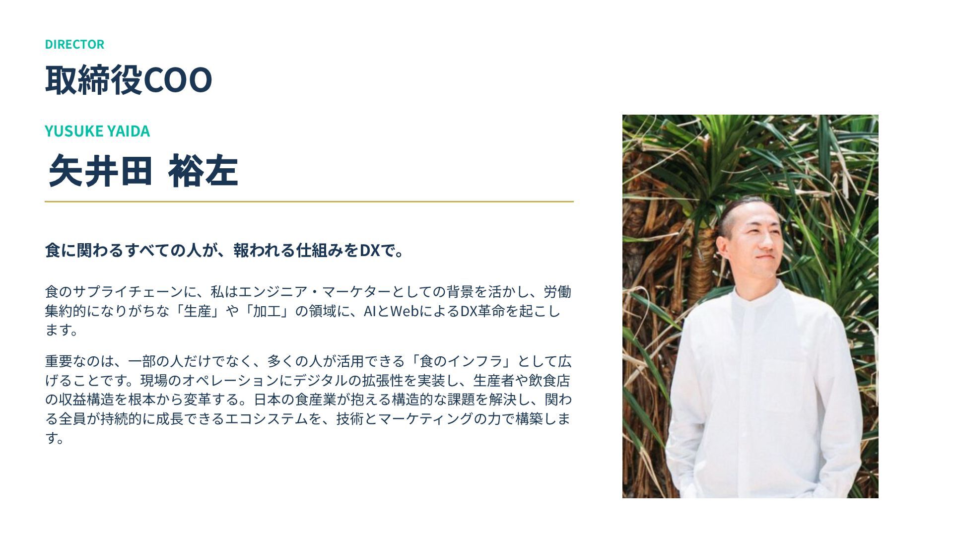 取締役COO YUSUKE YAIDA 矢井田 裕左 ⾷に関わるすべての⼈が、報われる仕組みをDXで。 ⾷のサプライチェーンに、私はエンジニア‧マーケターとしての背景を活かし、労働 集約的になりがちな「⽣産」や「加⼯」の領域に、AIとWebによるDX⾰命を起こし ます。 重要なのは、⼀部の⼈だけでなく、多くの⼈が活⽤できる「⾷のインフラ」として広