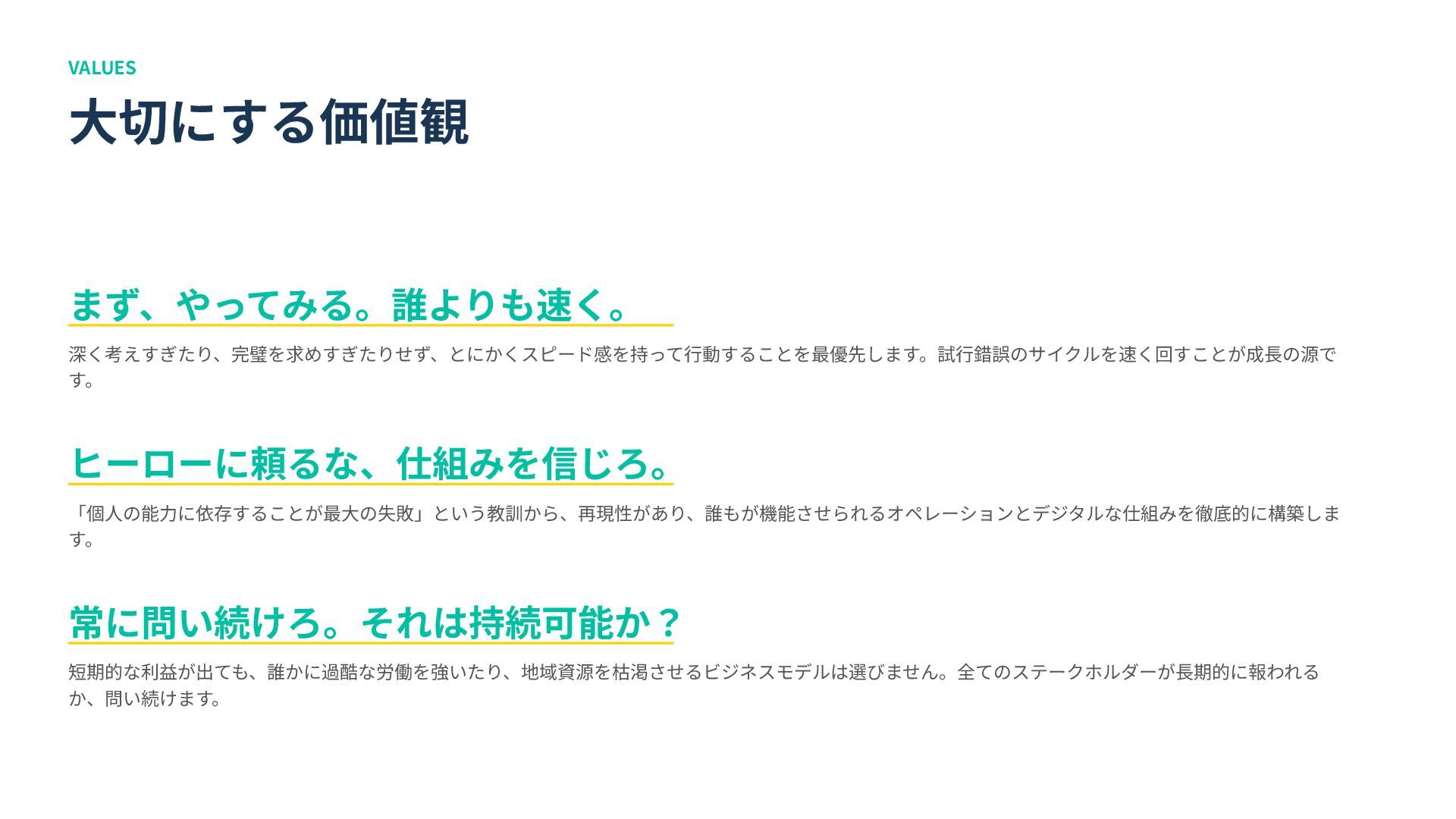 ⼤切にする価値観 まず、やってみる。誰よりも速く。 深く考えすぎたり、完璧を求めすぎたりせず、とにかくスピード感を持って⾏動することを最優先します。試⾏錯誤のサイクルを速く回すことが成⻑の源で す。 VALUES ヒーローに頼るな、仕組みを信じろ。 「個⼈の能⼒に依存することが最⼤の失敗」という教訓から、再現性があり、誰もが機能させられるオペレーションとデジタルな仕組みを徹底的に構築しま す。 常に問い続けろ。それは持続可能か? 短期的な利益が出ても、誰かに過酷な労働を強いたり、地域資源を枯渇させるビジネスモデルは選びません。全てのステークホルダーが⻑期的に報われる