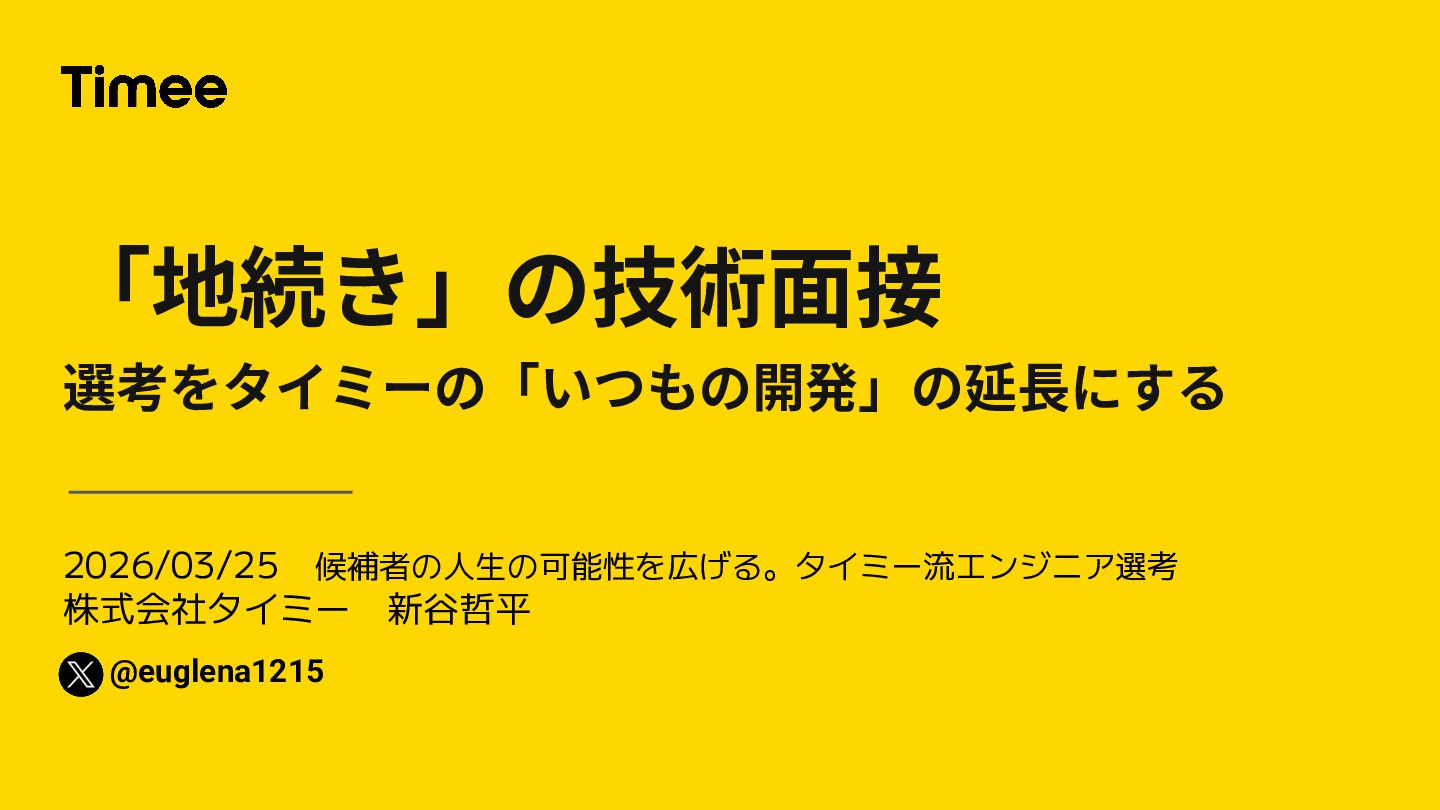 2026/03/25 候補者の人生の可能性を広げる。タイミー流エンジニア選考 株式会社タイミー 新谷哲平 「地続き」の技術⾯接 選考をタイミーの「いつもの開発」の延⻑にする @euglena1215