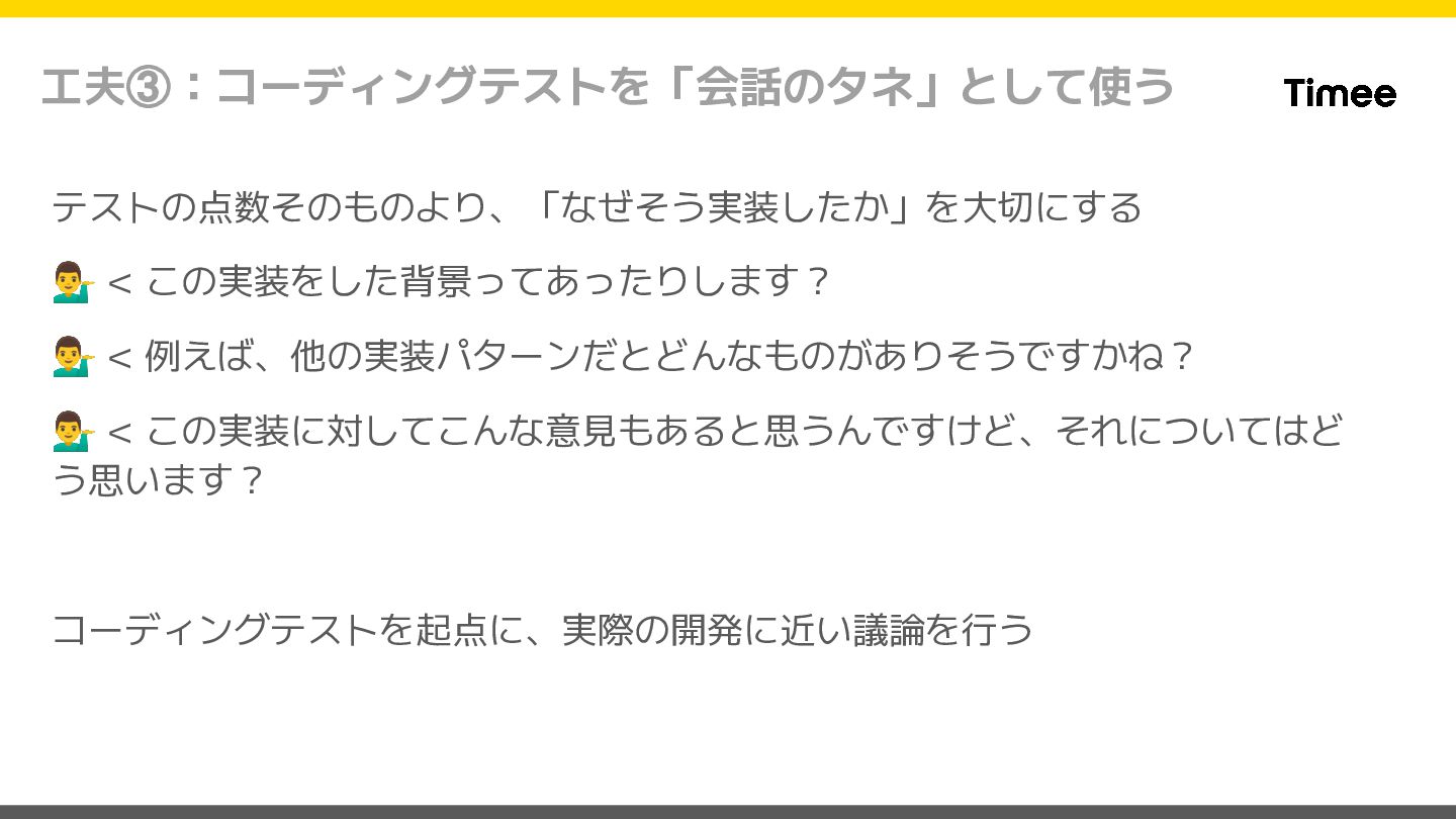 工夫③:コーディングテストを「会話のタネ」として使う テストの点数そのものより、「なぜそう実装したか」を大切にする < この実装をした背景ってあったりします? < 例えば、他の実装パターンだとどんなものがありそうですかね? <