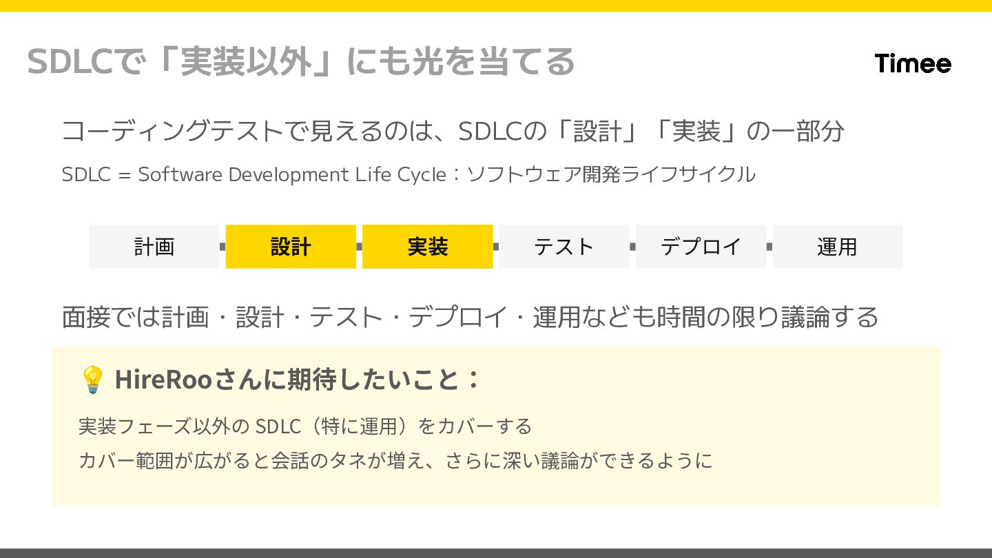 実装 テスト デプロイ 運⽤ 面接では計画・設計・テスト・デプロイ・運用なども時間の限り議論する 💡 HireRooさんに期待したいこと: 実装フェーズ以外の SDLC(特に運⽤)をカバーする カバー範囲が広がると会話のタネが増え、さらに深い議論ができるように