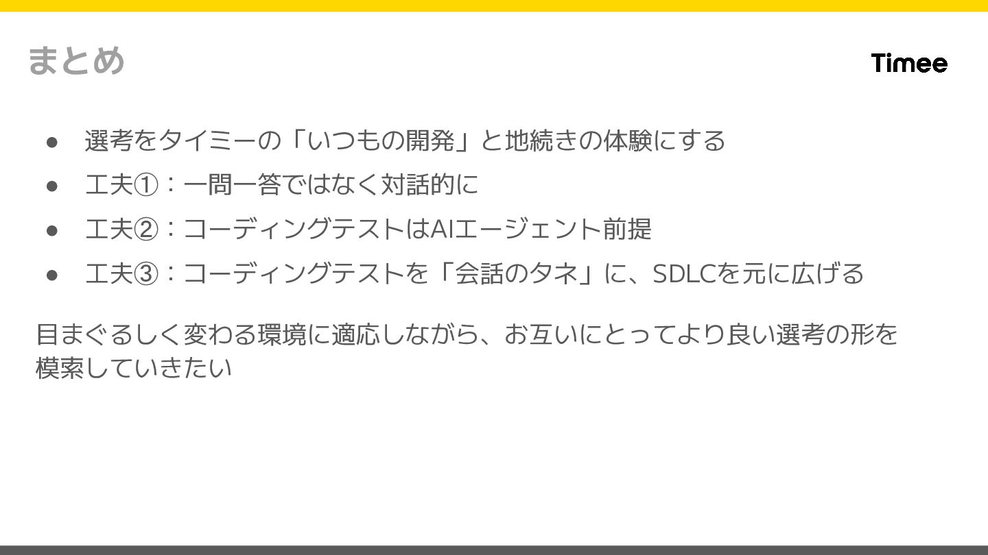 まとめ • 選考をタイミーの「いつもの開発」と地続きの体験にする • 工夫①:一問一答ではなく対話的に • 工夫②:コーディングテストはAIエージェント前提 • 工夫③:コーディングテストを「会話のタネ」に、SDLCを元に広げる 目まぐるしく変わる環境に適応しながら、お互いにとってより良い選考の形を