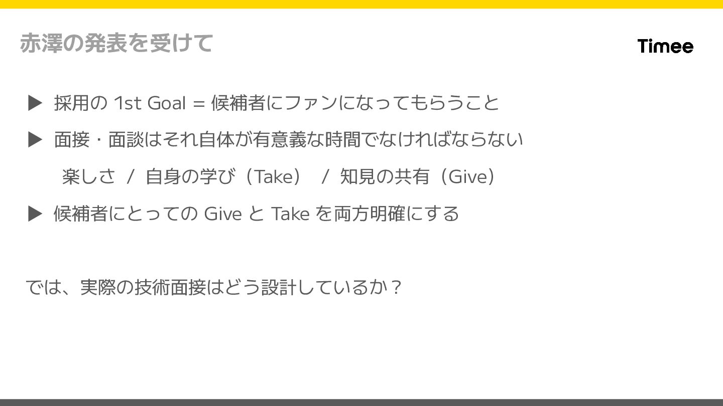 / 自身の学び(Take) / 知見の共有(Give) ▶ 候補者にとっての Give と Take を両方明確にする では、実際の技術面接はどう設計しているか?