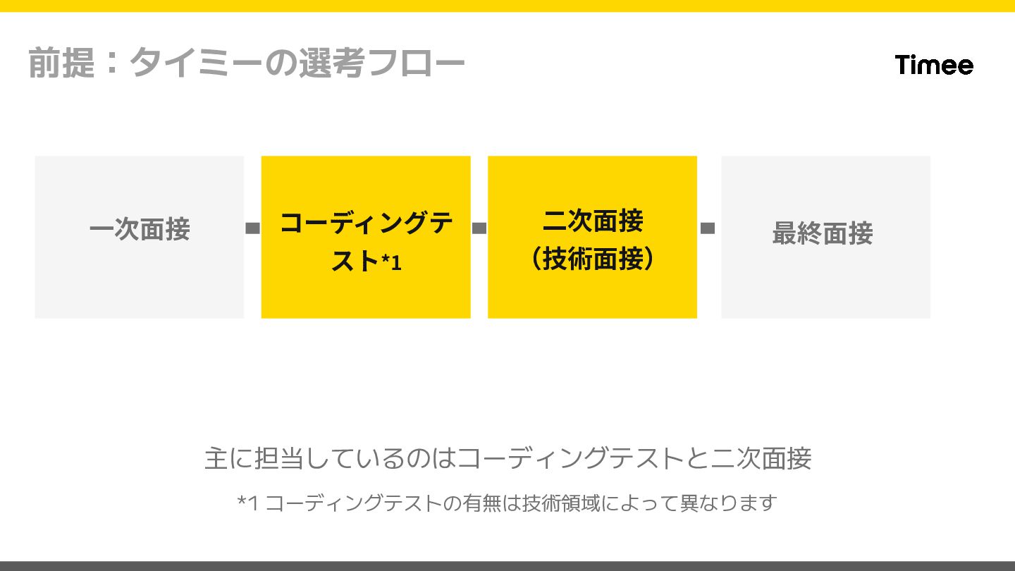 前提:タイミーの選考フロー ⼀次⾯接 コーディングテ スト*1 ⼆次⾯接 (技術⾯接) 主に担当しているのはコーディングテストと二次面接 *1 コーディングテストの有無は技術領域によって異なります 最終⾯接