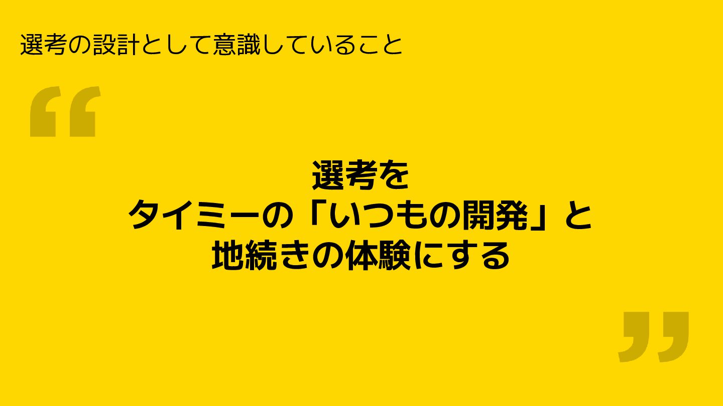 選考の設計として意識していること 選考を タイミーの「いつもの開発」と 地続きの体験にする