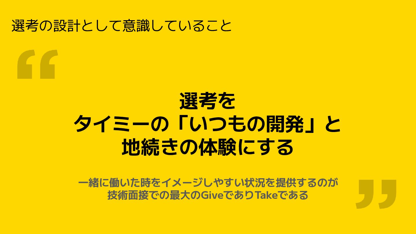 選考の設計として意識していること 選考を タイミーの「いつもの開発」と 地続きの体験にする 一緒に働いた時をイメージしやすい状況を提供するのが 技術面接での最大のGiveでありTakeである