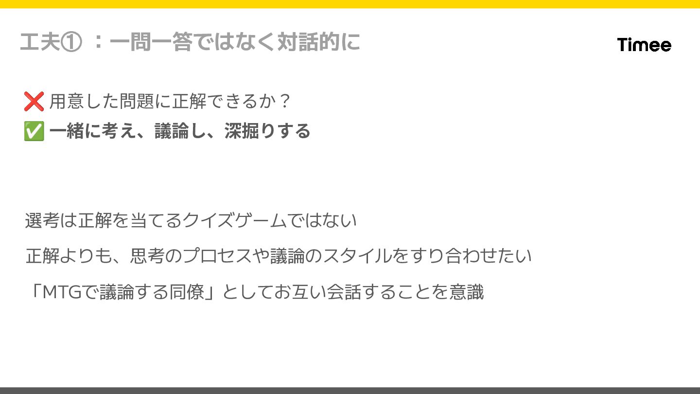 工夫① :一問一答ではなく対話的に 選考は正解を当てるクイズゲームではない 正解よりも、思考のプロセスや議論のスタイルをすり合わせたい 「MTGで議論する同僚」としてお互い会話することを意識 ❌ ⽤意した問題に正解できるか? ✅ ⼀緒に考え、議論し、深掘りする