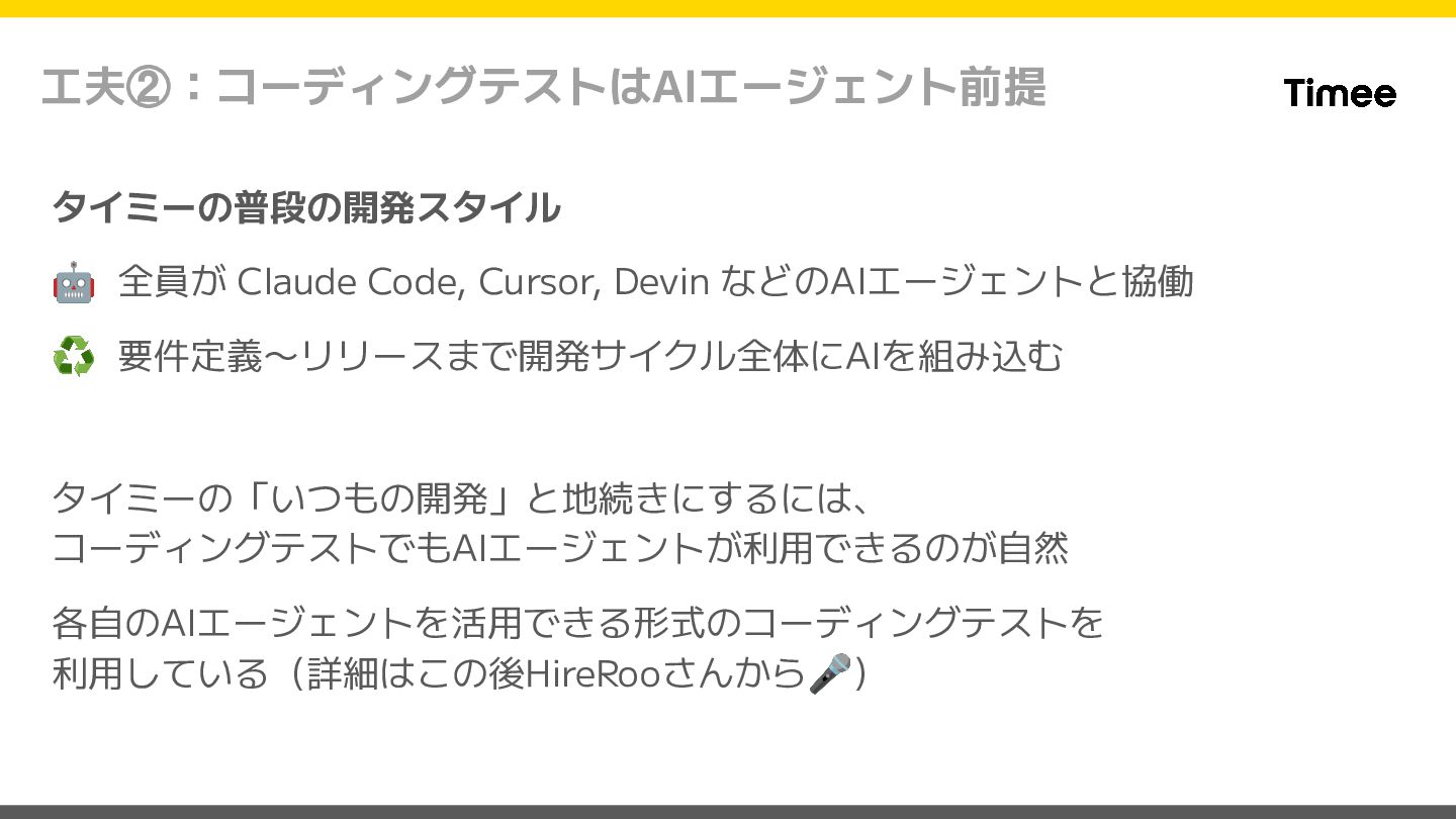 工夫②:コーディングテストはAIエージェント前提 タイミーの普段の開発スタイル 🤖 全員が Claude Code, Cursor, Devin などのAIエージェントと協働 ♻