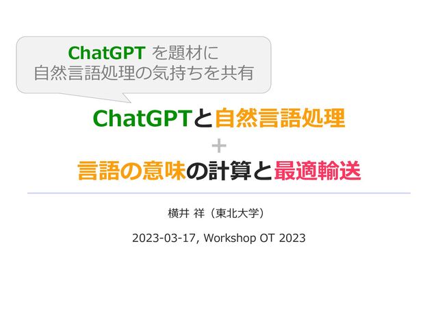 確率分布︓𝒂 = 1/𝑛, … , 1/𝑛 ,確率分布︓𝒃 = 1/𝑚, … , 1/𝑚 − 輸送コスト︓𝑪!" = 𝒘! − 𝒘" # $ − ⽂の⾮類似度のモデル︓ 𝑊%(𝒂, 𝒃; 𝑪) • 変更例︓Word Rotatorʼs Distance [Yokoi+ʼ20] − 確率分布︓𝒂 ∝ 𝒘% $, … , 𝒘& $ ,𝒃 ∝ 𝒘′% $, … , 𝒘′' $ − 輸送コスト︓𝑪!" = 1 − cos 𝒘!, 𝒘" # − ⽂の⾮類似度のモデル︓ OT(𝒂, 𝒃; 𝑪) 📄 Kusner+, From Word Embeddings To Document Distances (ICML 2015) 📄 Yokoi+, Word Rotator’s Distance (EMNLP 2020) https://arxiv.org/abs/2004.15003 📄 Schakel&Wilson, Measuring Word Significance using Distributed Representations of Words (arXiv 2015) 📄 Oyama+, Norm of word embedding encodes information gain (arXiv 2022) 単語ベクトルの⻑さには 単語の重要度が近似的に埋め込まれている [Schakel&Wilsonʼ15], [Oyama+ʼ22] なす⾓ (※) が単語の⾮類似度として有⽤ ※ 単語ベクトルの⻑さを無視した距離 NLP マンから⾒るとこちらの⽅が⾃然