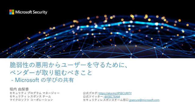 脆弱性の悪用からユーザーを守るために、 ベンダーが取り組むべきこと - Microsoft の学びの共有 垣内 由梨香 セキュリティ プログラム マネージャー