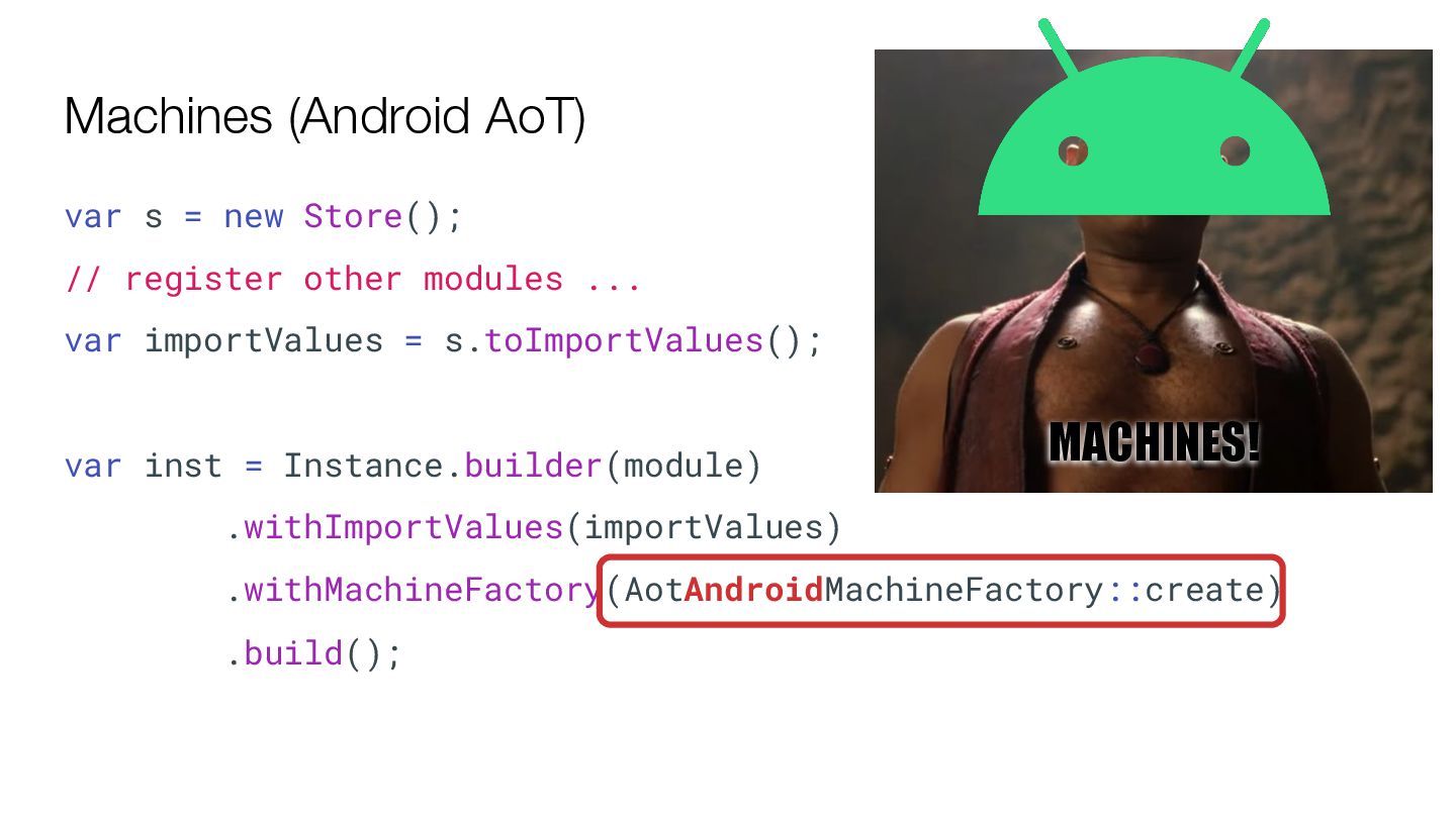 other modules ... var importValues = s.toImportValues(); var inst = Instance.builder(module) .withImportValues(importValues) .withMachineFactory(AotAndroidMachineFactory::create) .build(); MACHINES!