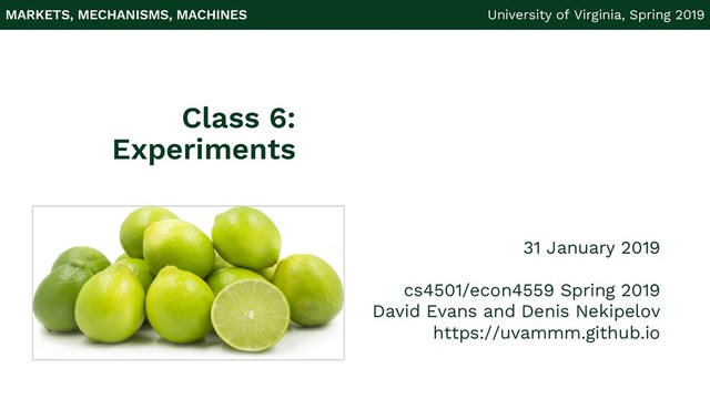 Experiments 31 January 2019 cs4501/econ4559 Spring 2019 David Evans and Denis Nekipelov https://uvammm.github.io