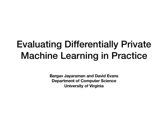0.01 0.05 0.1 0.5 1 5 10 50 100 500 1000 Privacy Budget ϵ Accuracy Loss Privacy Leakage Theoretical Guarantee RDP Acc Loss RDP Leakage NC Acc Loss Bridging the gap between theoretical bound on leakage and the leakage of practical attacks Conclusion Questions? Thank You! Bargav Jayaraman [email protected] Privacy doesn’t come for free NC Leakage https://github.com/bargavj/EvaluatingDPML