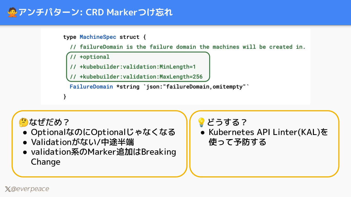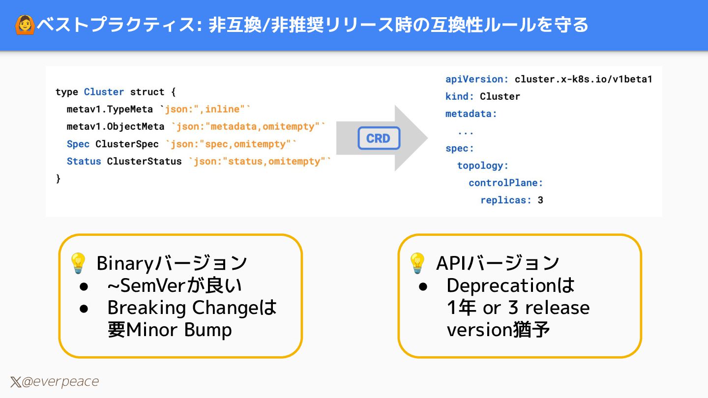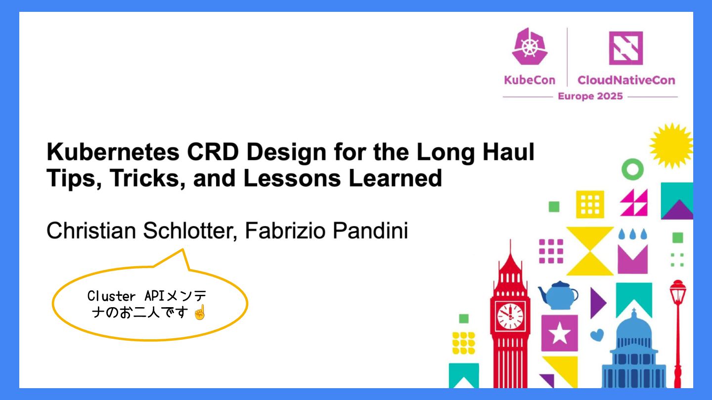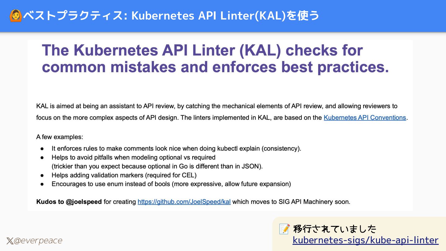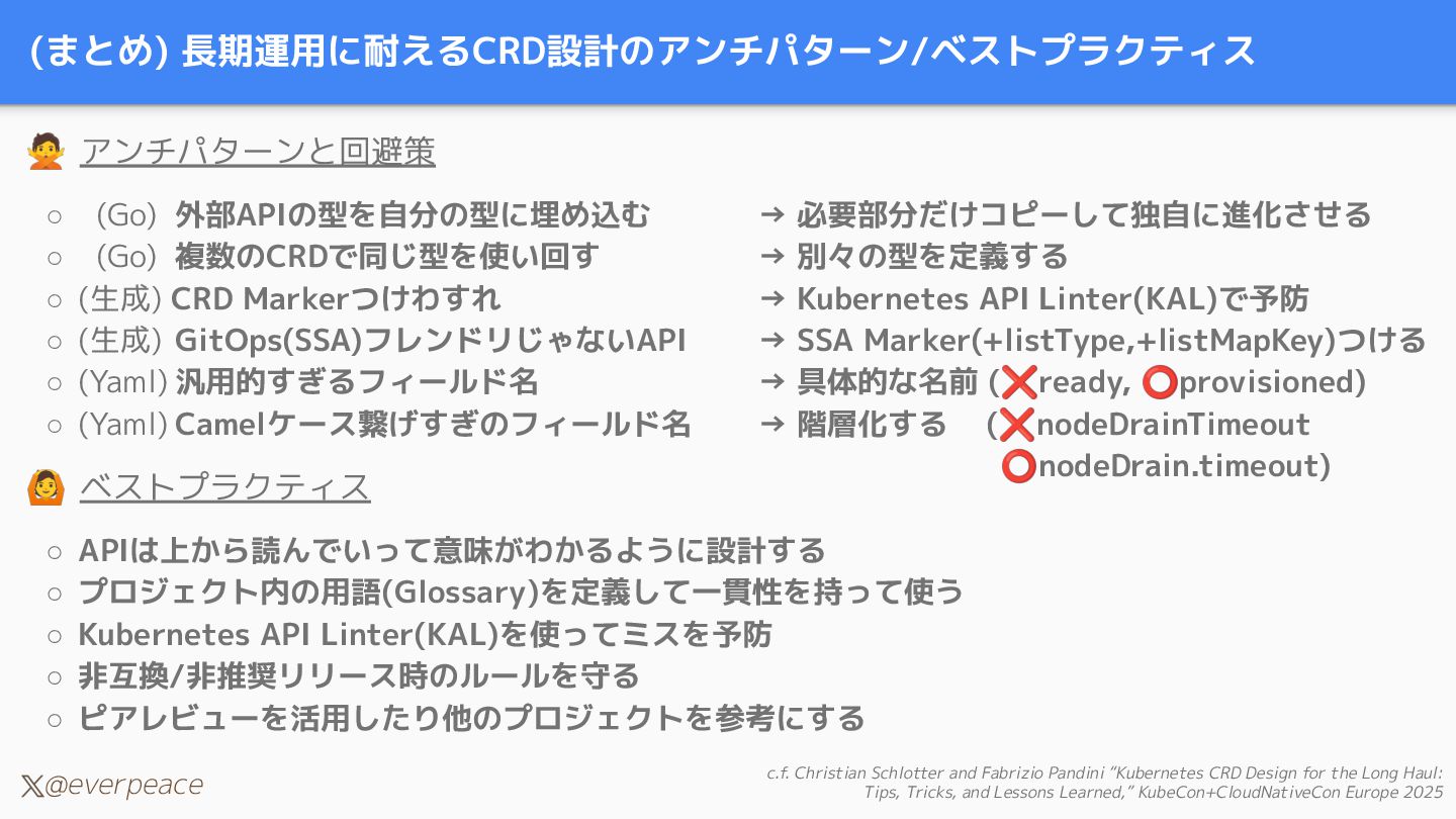 ◦ (Go) 複数のCRDで同じ型を使い回す → 別々の型を定義する ◦ (生成) CRD Markerつけわすれ → Kubernetes API Linter(KAL)で予防 ◦ (生成) GitOps(SSA)フレンドリじゃないAPI → SSA Marker(+listType,+listMapKey)つける ◦ (Yaml) 汎用的すぎるフィールド名 → 具体的な名前 (❌ready, ⭕provisioned) ◦ (Yaml) Camelケース繋げすぎのフィールド名 → 階層化する (❌nodeDrainTimeout ⭕nodeDrain.timeout) 🙆 ベストプラクティス ◦ APIは上から読んでいって意味がわかるように設計する ◦ プロジェクト内の用語(Glossary)を定義して一貫性を持って使う ◦ Kubernetes API Linter(KAL)を使ってミスを予防 ◦ 非互換/非推奨リリース時のルールを守る ◦ ピアレビューを活用したり他のプロジェクトを参考にする c.f. Christian Schlotter and Fabrizio Pandini “Kubernetes CRD Design for the Long Haul: Tips, Tricks, and Lessons Learned,” KubeCon+CloudNativeCon Europe 2025
