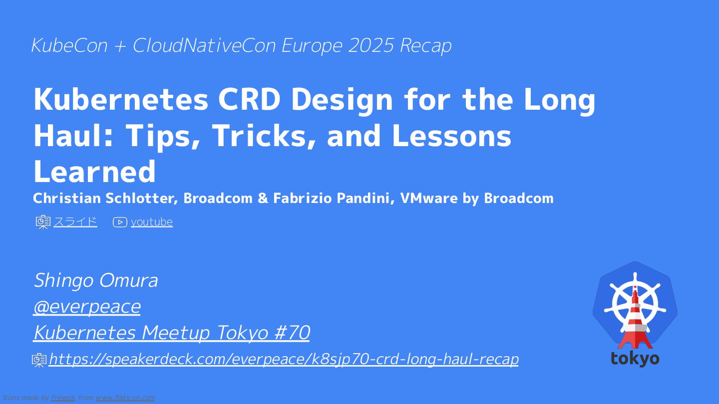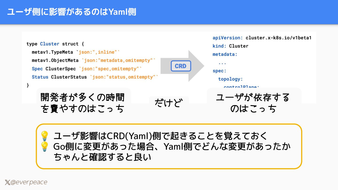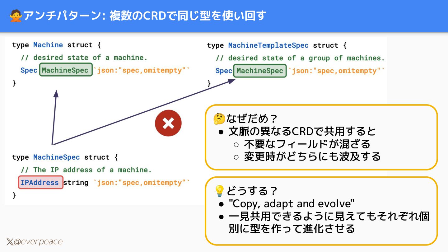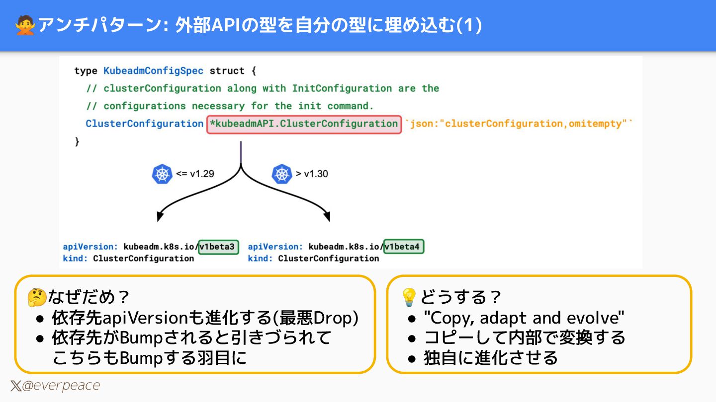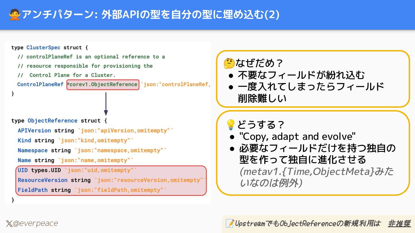 ◦ (Go) 複数のCRDで同じ型を使い回す → 別々の型を定義する ◦ (生成) CRD Markerつけわすれ → Kubernetes API Linter(KAL)で予防 ◦ (生成) GitOps(SSA)フレンドリじゃないAPI → SSA Marker(+listType,+listMapKey)つける ◦ (Yaml) 汎用的すぎるフィールド名 → 具体的な名前 (❌ready, ⭕provisioned) ◦ (Yaml) Camelケース繋げすぎのフィールド名 → 階層化する (❌nodeDrainTimeout ⭕nodeDrain.timeout) 🙆 ベストプラクティス ◦ APIは上から読んでいって意味がわかるように設計する ◦ プロジェクト内の用語(Glossary)を定義して一貫性を持って使う ◦ Kubernetes API Linter(KAL)を使ってミスを予防 ◦ 非互換/非推奨リリース時のルールを守る ◦ ピアレビューを活用したり他のプロジェクトを参考にする c.f. Christian Schlotter and Fabrizio Pandini “Kubernetes CRD Design for the Long Haul: Tips, Tricks, and Lessons Learned,” KubeCon+CloudNativeCon Europe 2025