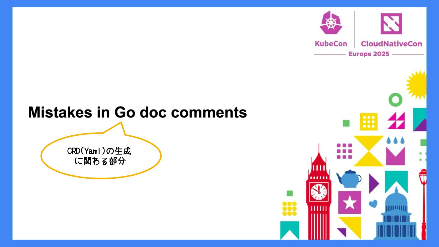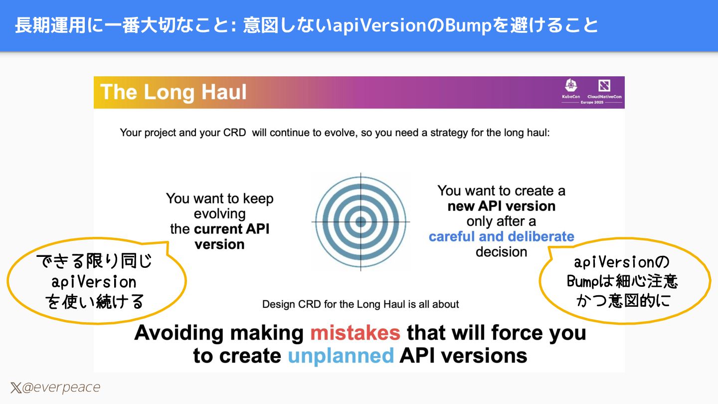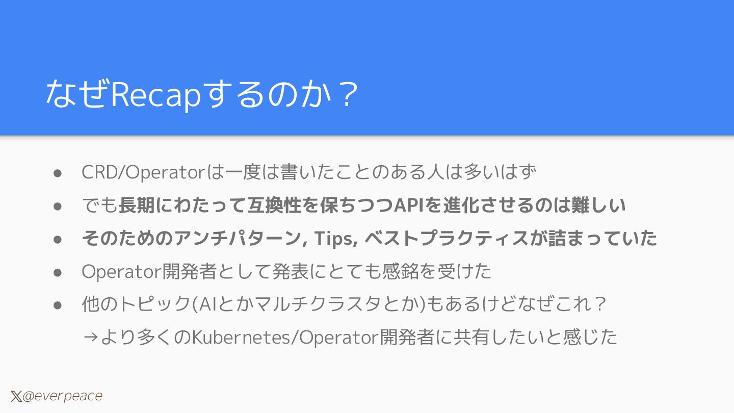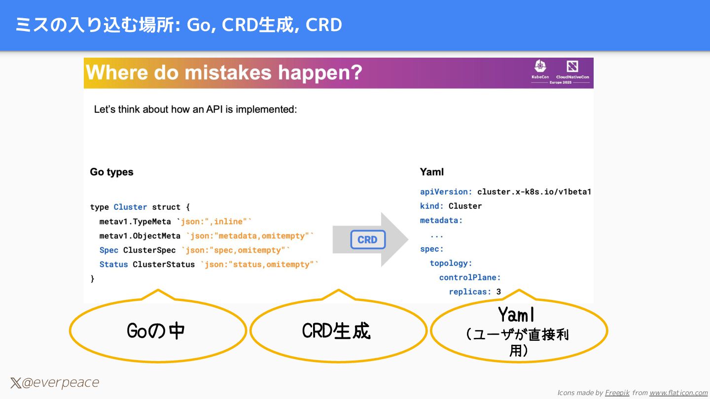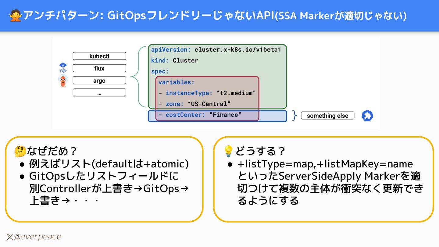 ◦ (Go) 複数のCRDで同じ型を使い回す → 別々の型を定義する ◦ (生成) CRD Markerつけわすれ → Kubernetes API Linter(KAL)で予防 ◦ (生成) GitOps(SSA)フレンドリじゃないAPI → SSA Marker(+listType,+listMapKey)つける ◦ (Yaml) 汎用的すぎるフィールド名 → 具体的な名前 (❌ready, ⭕provisioned) ◦ (Yaml) Camelケース繋げすぎのフィールド名 → 階層化する (❌nodeDrainTimeout ⭕nodeDrain.timeout) 🙆 ベストプラクティス ◦ APIは上から読んでいって意味がわかるように設計する ◦ プロジェクト内の用語(Glossary)を定義して一貫性を持って使う ◦ Kubernetes API Linter(KAL)を使ってミスを予防 ◦ 非互換/非推奨リリース時のルールを守る ◦ ピアレビューを活用したり他のプロジェクトを参考にする c.f. Christian Schlotter and Fabrizio Pandini “Kubernetes CRD Design for the Long Haul: Tips, Tricks, and Lessons Learned,” KubeCon+CloudNativeCon Europe 2025