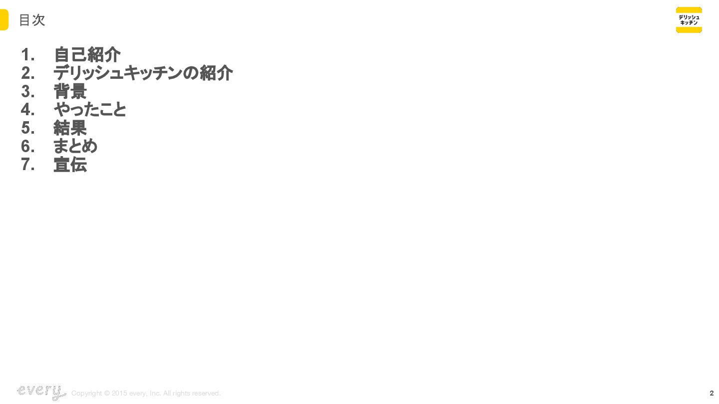 1. 自己紹介 2. デリッシュキッチンの紹介 3. 背景 4. やったこと 5. 結果 6. まとめ 7. 宣伝