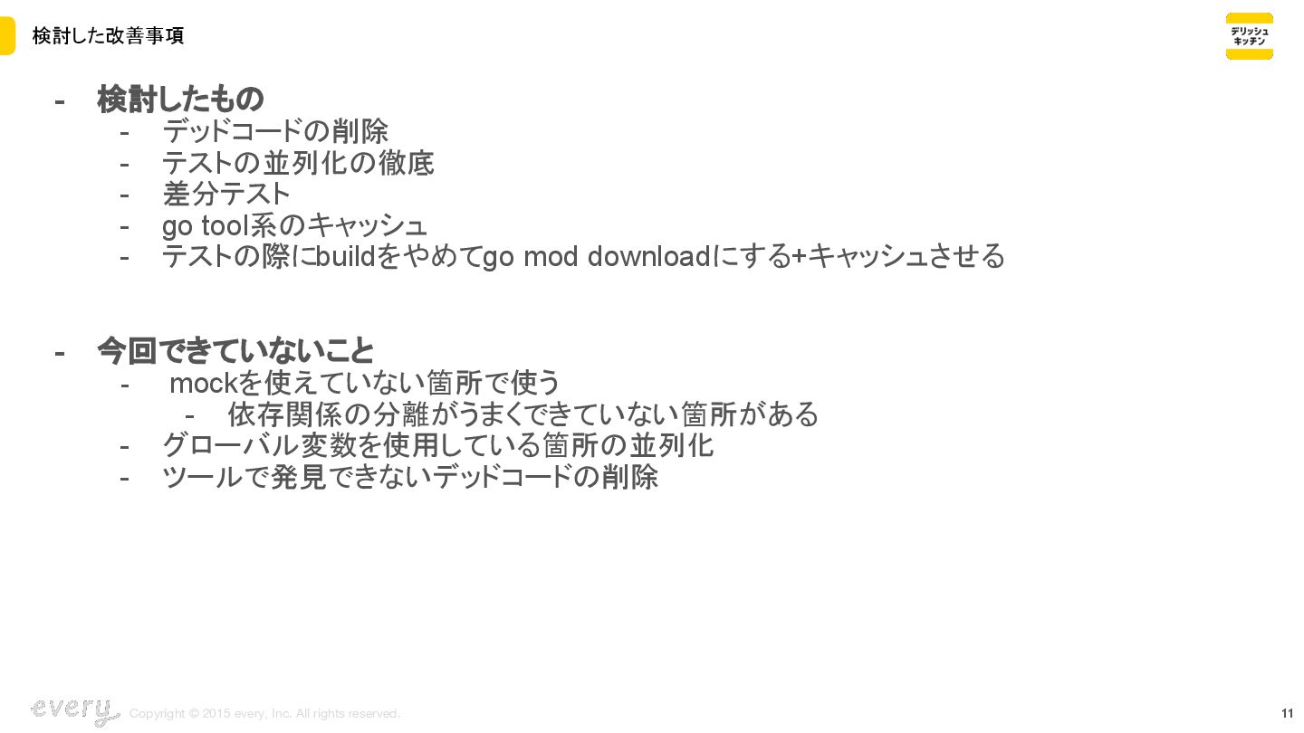 - 検討したもの - デッドコードの削除 - テストの並列化の徹底 - 差分テスト - go tool系のキャッシュ - テストの際にbuildをやめてgo mod downloadにする+キャッシュさせる - 今回できていないこと - mockを使えていない箇所で使う - 依存関係の分離がうまくできていない箇所がある - グローバル変数を使用している箇所の並列化 - ツールで発見できないデッドコードの削除