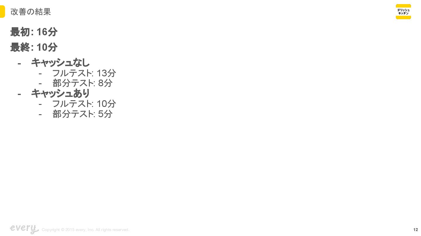 最初: 16分 最終: 10分 - キャッシュなし - フルテスト: 13分 - 部分テスト: 8分 - キャッシュあり - フルテスト: 10分 - 部分テスト: 5分