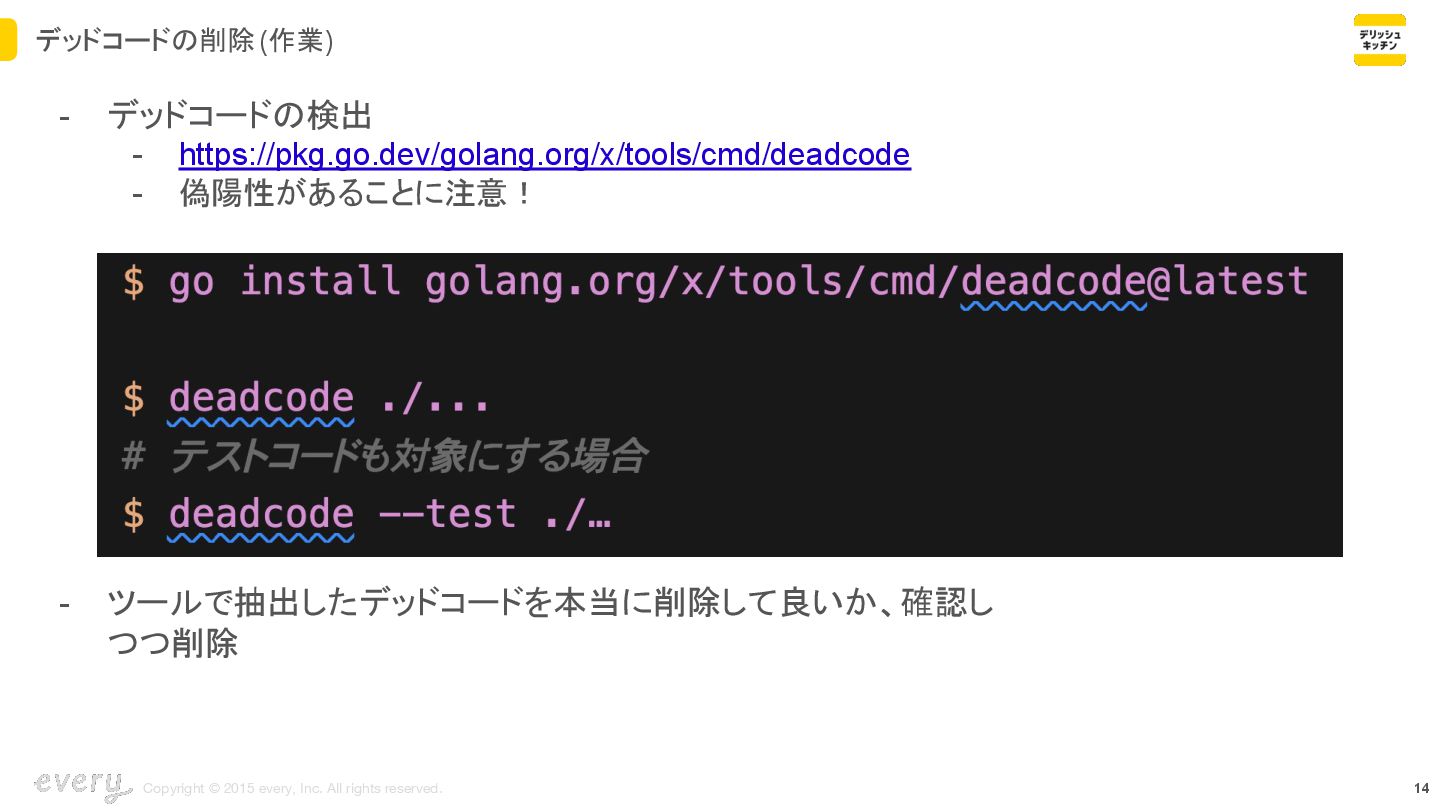 - デッドコードの検出 - https://pkg.go.dev/golang.org/x/tools/cmd/deadcode - 偽陽性があることに注意! - ツールで抽出したデッドコードを本当に削除して良いか、確認し つつ削除