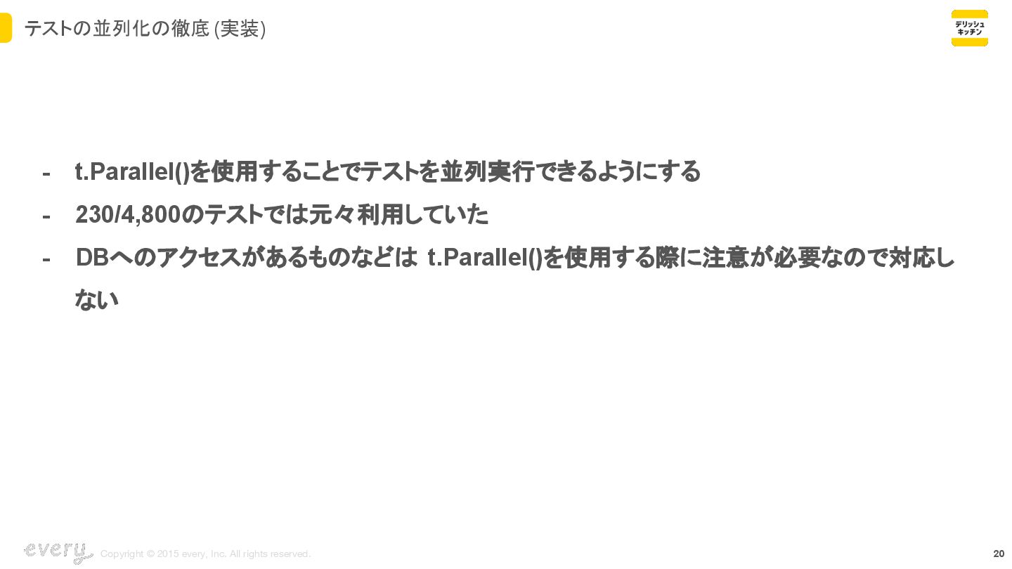 20 Copyright © 2015 every, Inc. All rights reserved. テストの並列化の徹底