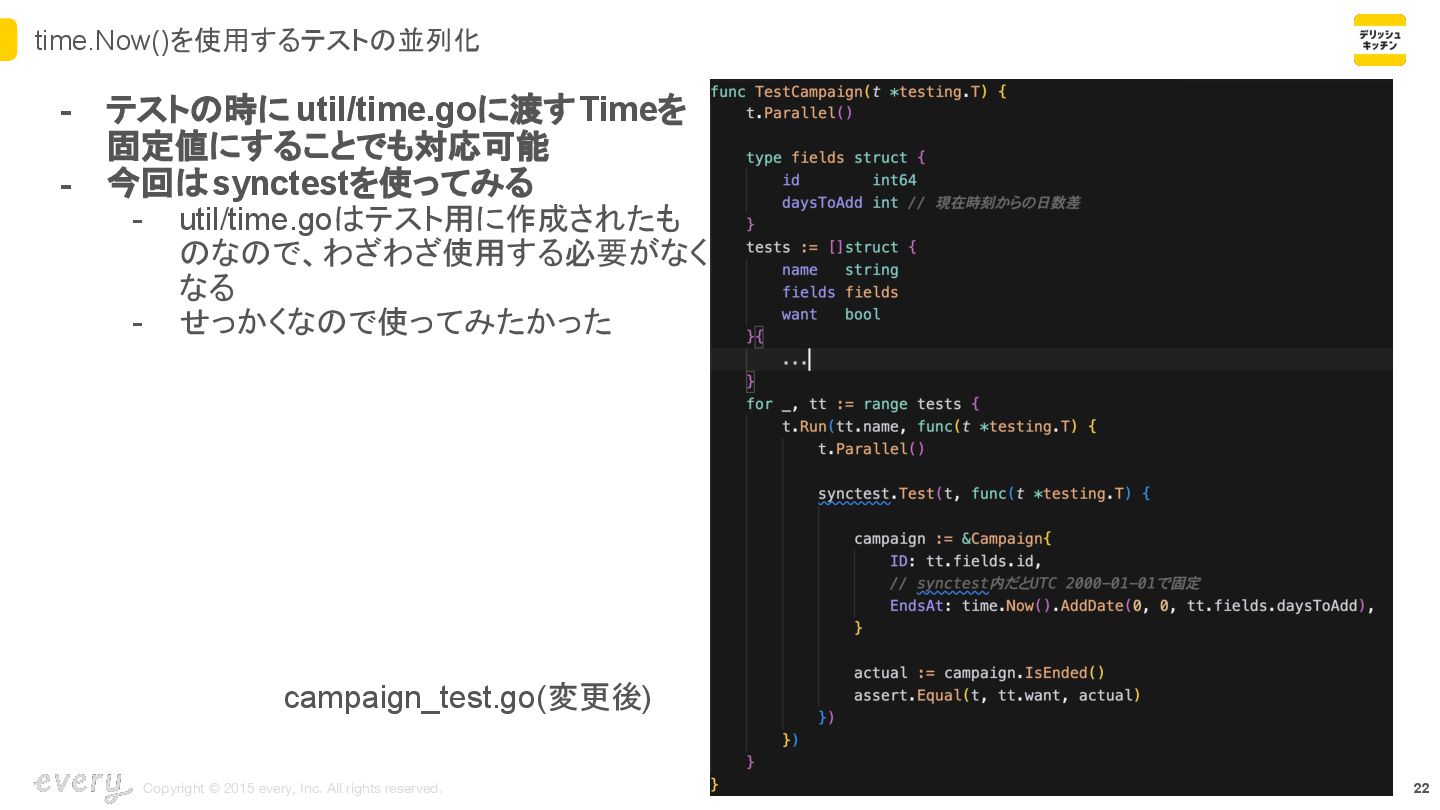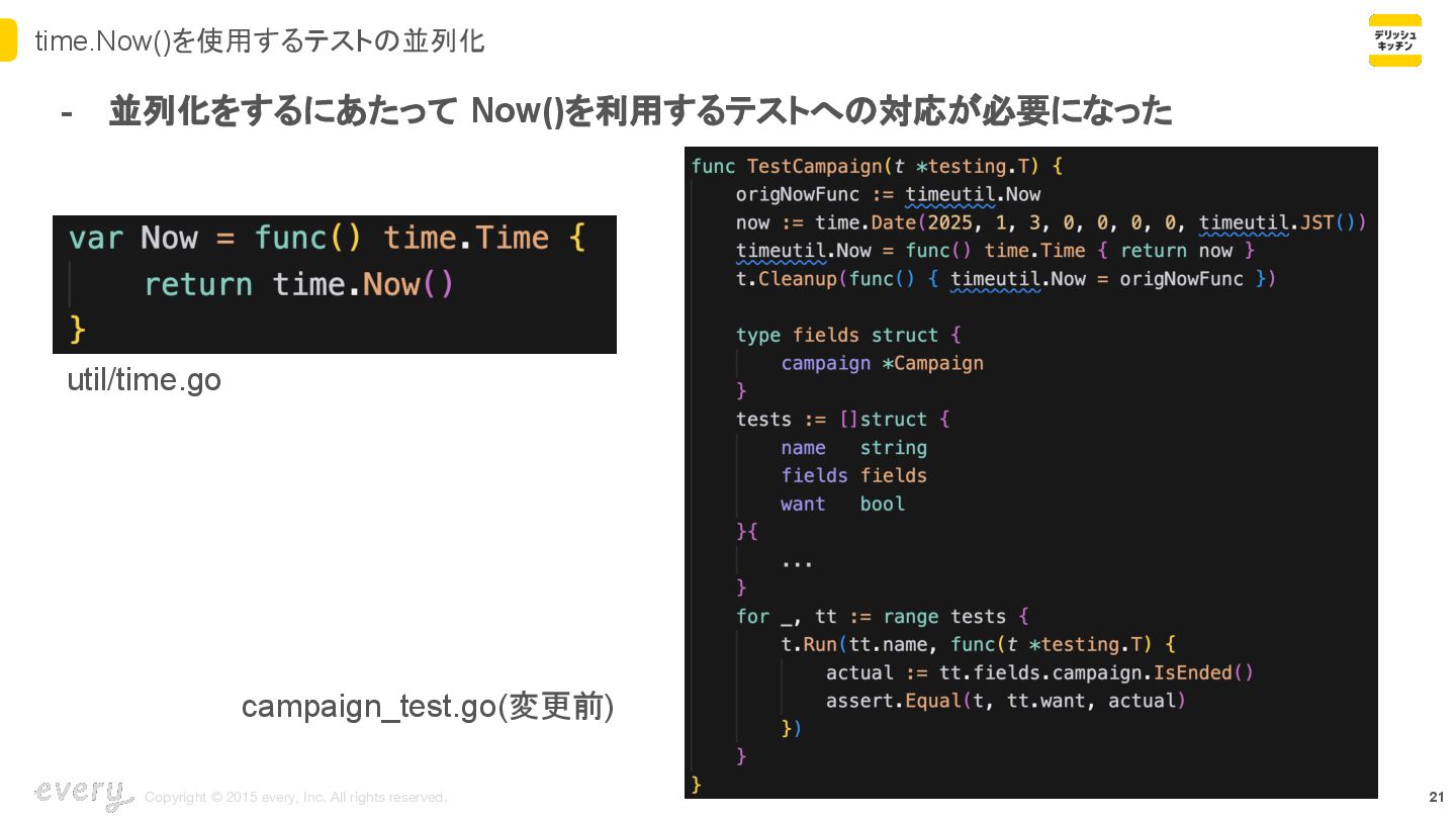21 Copyright © 2015 every, Inc. All rights reserved. time.Now()を使用するテストの並列化
