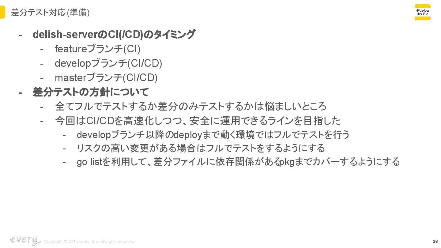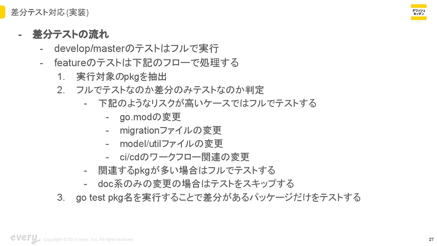 - delish-serverのCI(/CD)のタイミング - featureブランチ(CI) - developブランチ(CI/CD) - masterブランチ(CI/CD) - 差分テストの方針について - 全てフルでテストするか差分のみテストするかは悩ましいところ - 今回はCI/CDを高速化しつつ、安全に運用できるラインを目指した - developブランチ以降のdeployまで動く環境ではフルでテストを行う - リスクの高い変更がある場合はフルでテストをするようにする - go listを利用して、差分ファイルに依存関係がある pkgまでカバーするようにする