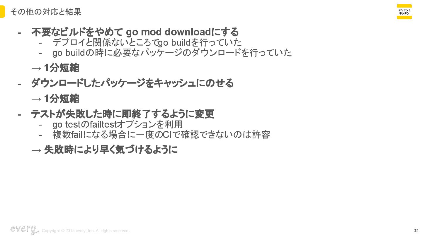 - 不要なビルドをやめて go mod downloadにする - デプロイと関係ないところでgo buildを行っていた - go buildの時に必要なパッケージのダウンロードを行っていた → 1分短縮 - ダウンロードしたパッケージをキャッシュにのせる → 1分短縮 - テストが失敗した時に即終了するように変更 - go testのfailtestオプションを利用 - 複数failになる場合に一度のCIで確認できないのは許容 → 失敗時により早く気づけるように