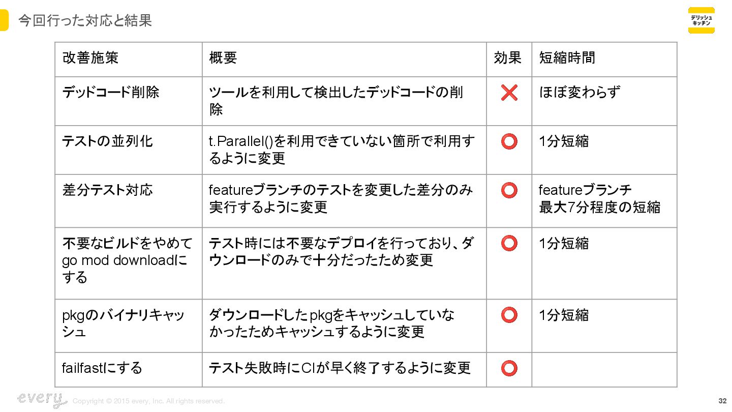 改善施策 概要 効果 短縮時間 デッドコード削除 ツールを利用して検出したデッドコードの削 除 ❌ ほぼ変わらず テストの並列化 t.Parallel()を利用できていない箇所で利用す るように変更 ⭕ 1分短縮 差分テスト対応 featureブランチのテストを変更した差分のみ 実行するように変更 ⭕ featureブランチ 最大7分程度の短縮 不要なビルドをやめて go mod downloadに する テスト時には不要なデプロイを行っており、ダ ウンロードのみで十分だったため変更 ⭕ 1分短縮 pkgのバイナリキャッ シュ ダウンロードしたpkgをキャッシュしていな かったためキャッシュするように変更 ⭕ 1分短縮 failfastにする テスト失敗時にCIが早く終了するように変更 ⭕