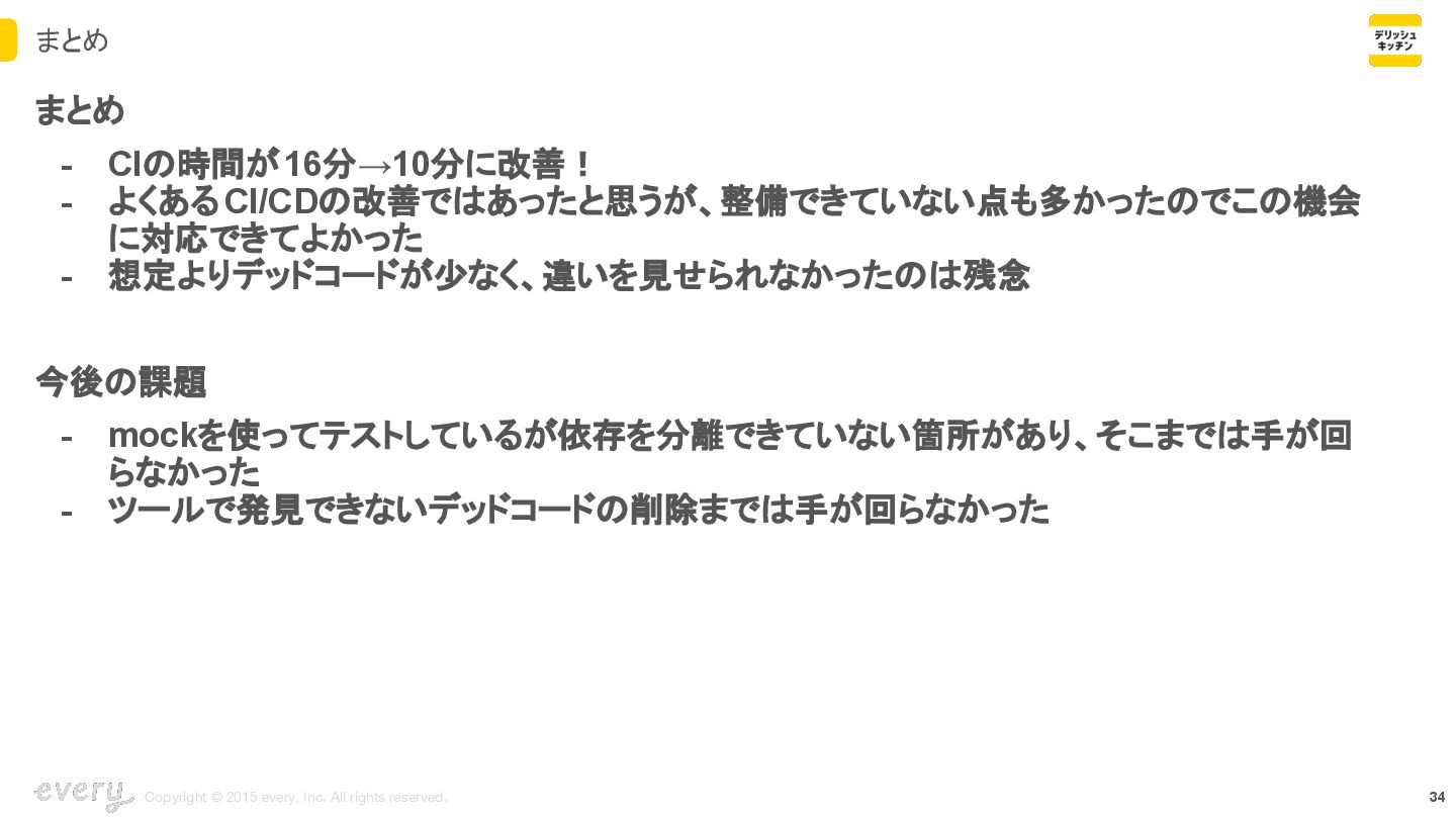 まとめ - CIの時間が16分→10分に改善! - よくあるCI/CDの改善ではあったと思うが、整備できていない点も多かったのでこの機会 に対応できてよかった - 想定よりデッドコードが少なく、違いを見せられなかったのは残念 今後の課題 - mockを使ってテストしているが依存を分離できていない箇所があり、そこまでは手が回 らなかった - ツールで発見できないデッドコードの削除までは手が回らなかった