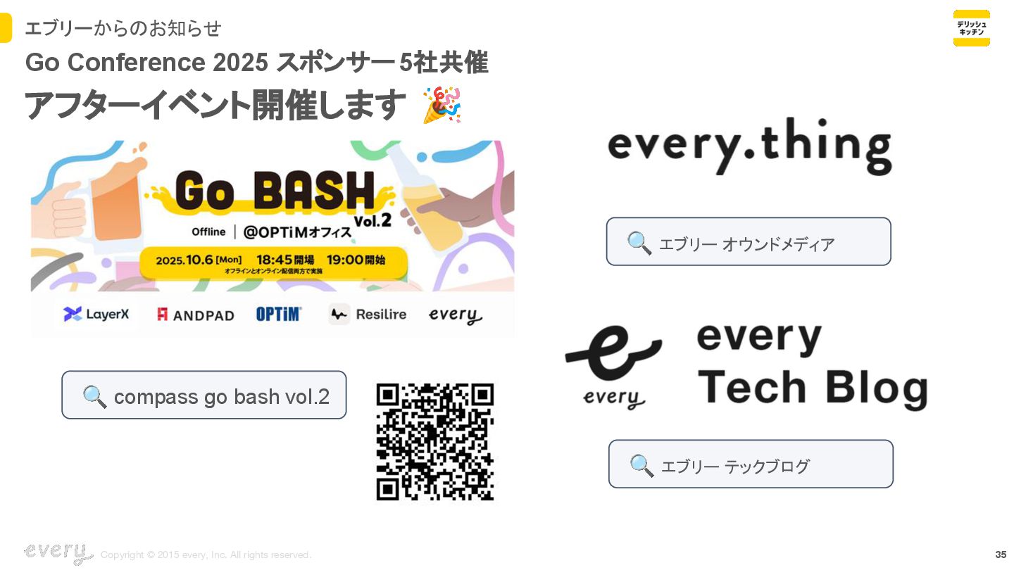 Go Conference 2025 スポンサー 5社共催 アフターイベント開催します 🎉 🔍 compass go bash vol.2 🔍 エブリー オウンドメディア 🔍 エブリー テックブログ