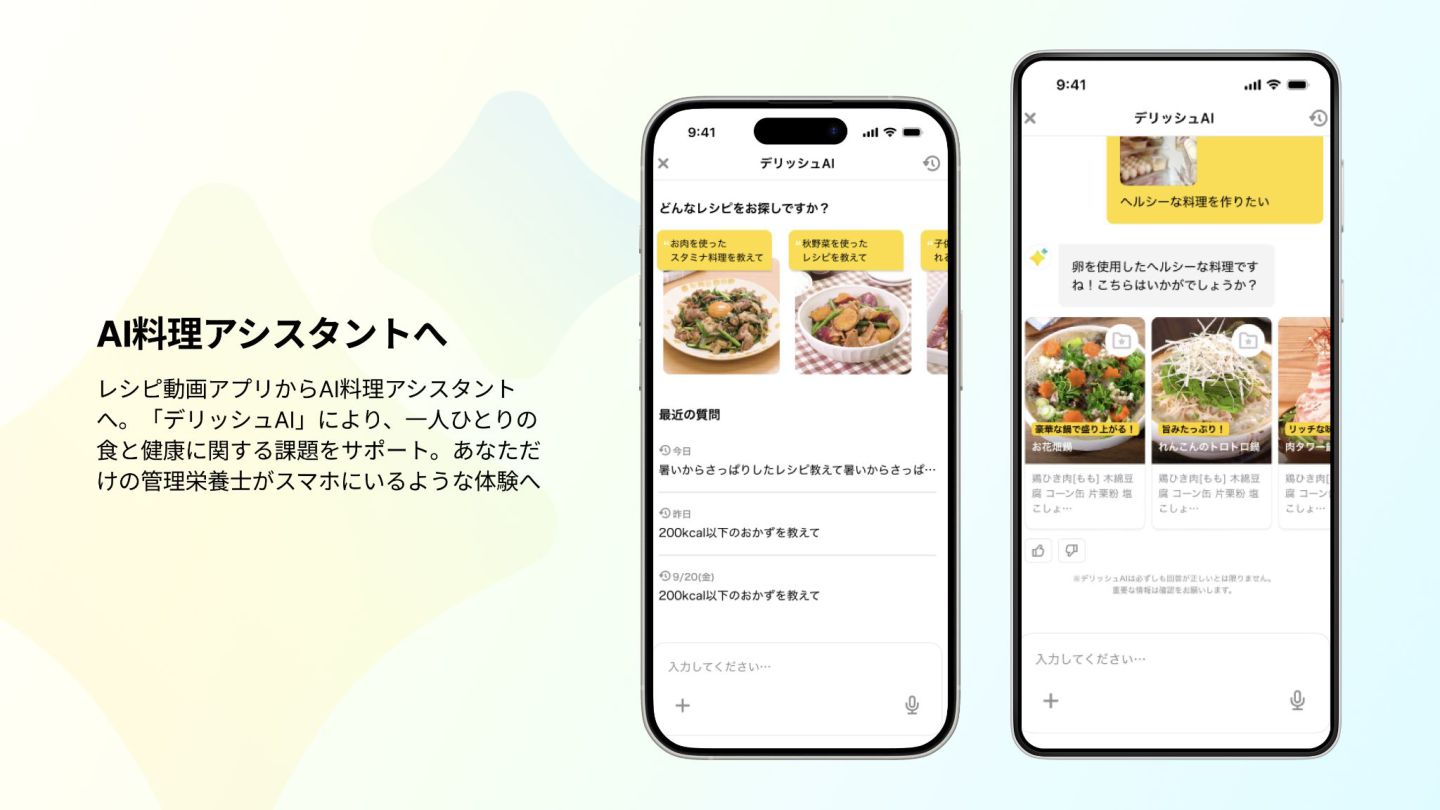 レシピ提案 / レシピ検索 / 献立機能 買い物リスト / チラシ / 店頭ビーコン連動 調理手順動画/キッチンモード / 作った・レビュー / お気に入り 菅原千遥 デリッシュキッチン カンパニー長 料理研究家 斎藤 香織 副編集長 管理栄養士 • 30名以上の食のプロが、蓄積 データに基づきオリジナル レシピを日々考案 • 月間1,500本以上の動画配信 サービス・機能 レシピ検討 買い物 料理中・料理後 専門家によるレシピ考案・監修 ▪ 日本最大級のレシピ動画サービス ▪ 「誰でも簡単においしく作れるレシピ動画」毎日配信 ▪ 全レシピ、管理栄養士が監修!蓄積データによるオリジナルレシピを考案 ▪ SNS/APP/WEBを通じて延べ56,000本以上のレシピ動画を提供