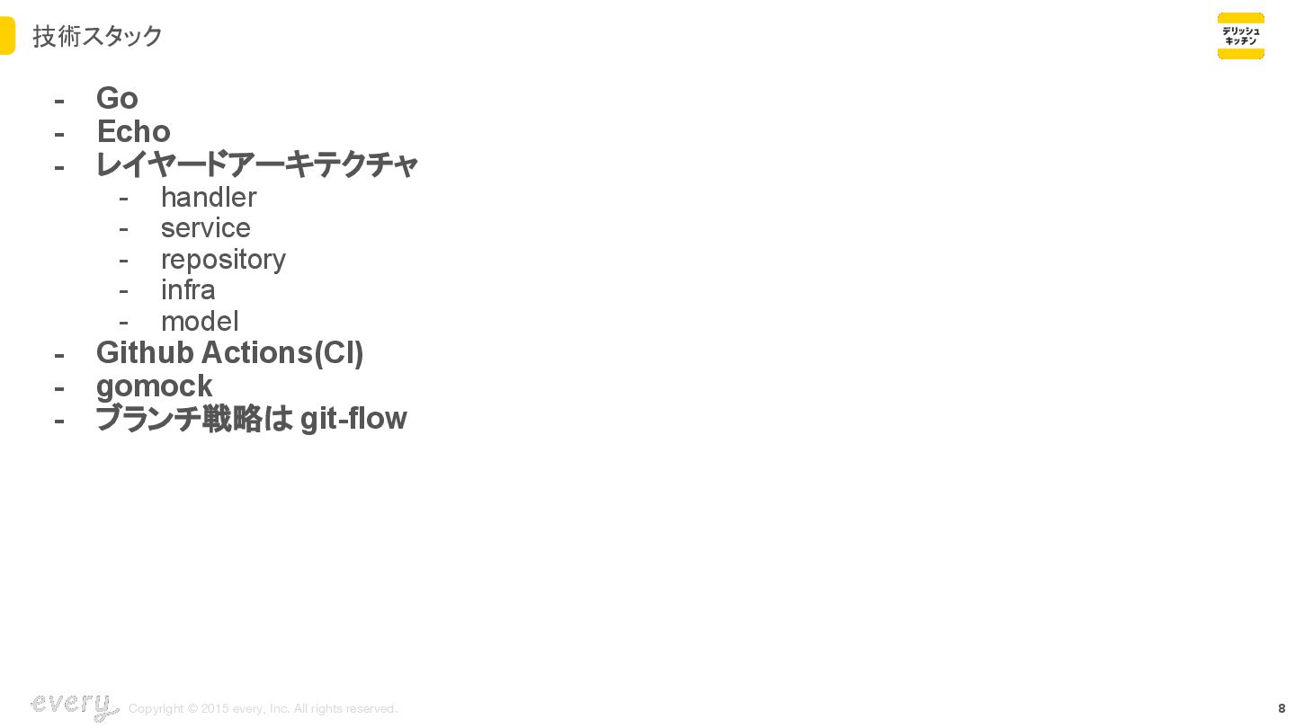 - Go - Echo - レイヤードアーキテクチャ - handler - service - repository - infra - model - Github Actions(CI) - gomock - ブランチ戦略は git-flow
