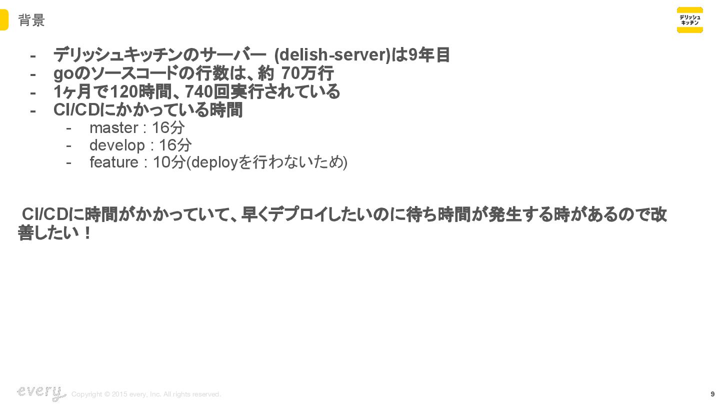 - デリッシュキッチンのサーバー (delish-server)は9年目 - goのソースコードの行数は、約 70万行 - 1ヶ月で120時間、740回実行されている - CI/CDにかかっている時間 - master : 16分 - develop : 16分 - feature : 10分(deployを行わないため) CI/CDに時間がかかっていて、早くデプロイしたいのに待ち時間が発生する時があるので改 善したい!