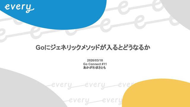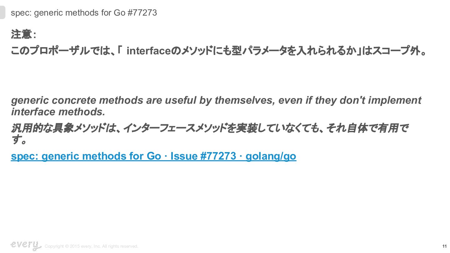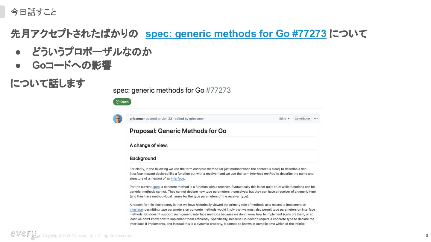 先月アクセプトされたばかりの spec: generic methods for Go #77273 について • どういうプロポーザルなのか • Goコードへの影響 について話します