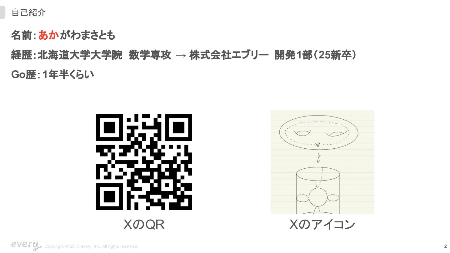 名前:あかがわまさとも 経歴:北海道大学大学院 数学専攻 → 株式会社エブリー 開発1部(25新卒) Go歴:1年半くらい XのQR Xのアイコン