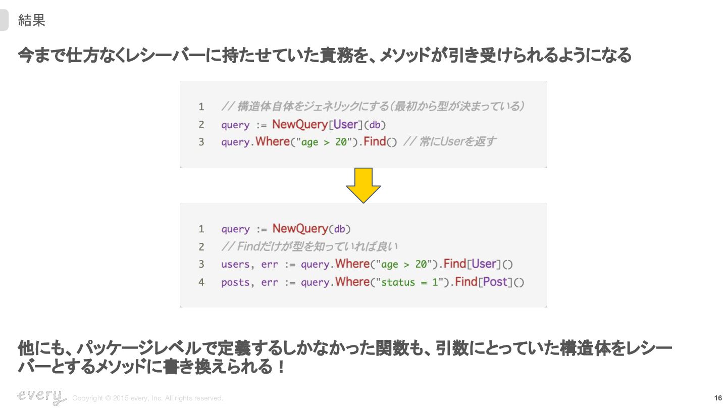 今まで仕方なくレシーバーに持たせていた責務を、メソッドが引き受けられるようになる 他にも、パッケージレベルで定義するしかなかった関数も、引数にとっていた構造体をレシー バーとするメソッドに書き換えられる!