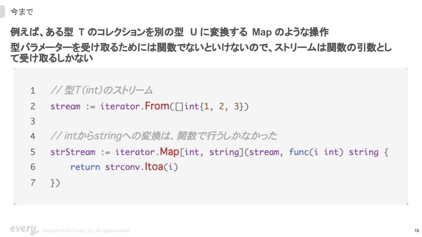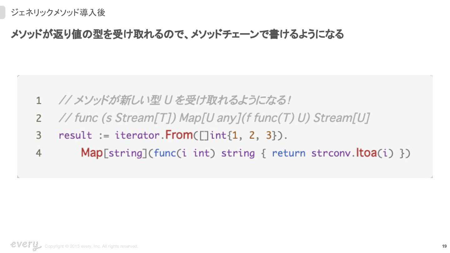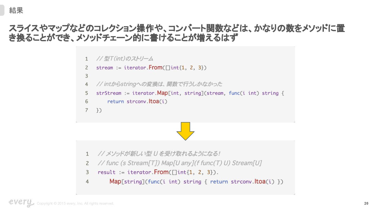 スライスやマップなどのコレクション操作や、コンバート関数などは、かなりの数をメソッドに置 き換ることができ、メソッドチェーン的に書けることが増えるはず