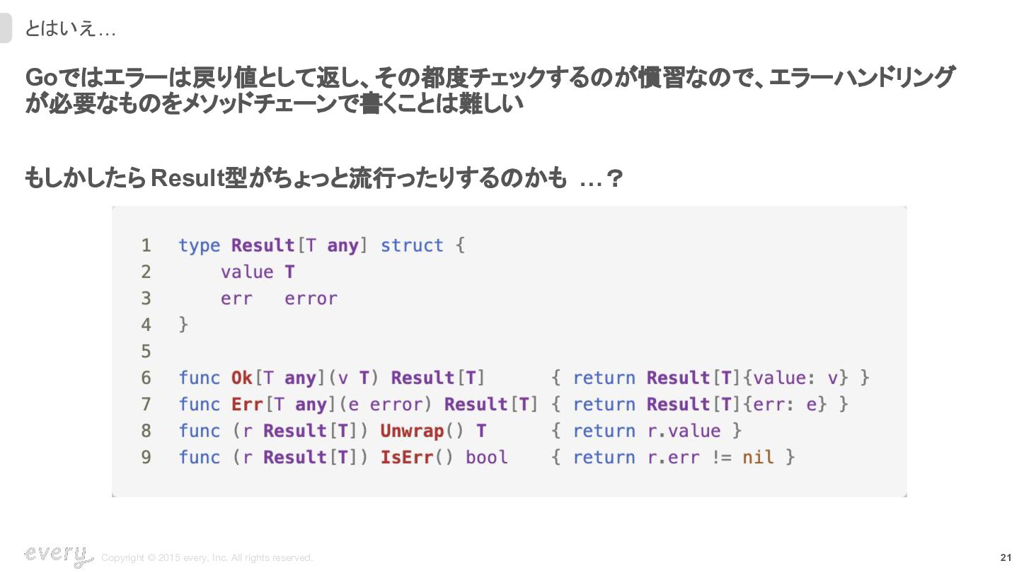 Goではエラーは戻り値として返し、その都度チェックするのが慣習なので、エラーハンドリング が必要なものをメソッドチェーンで書くことは難しい もしかしたら Result型がちょっと流行ったりするのかも …?