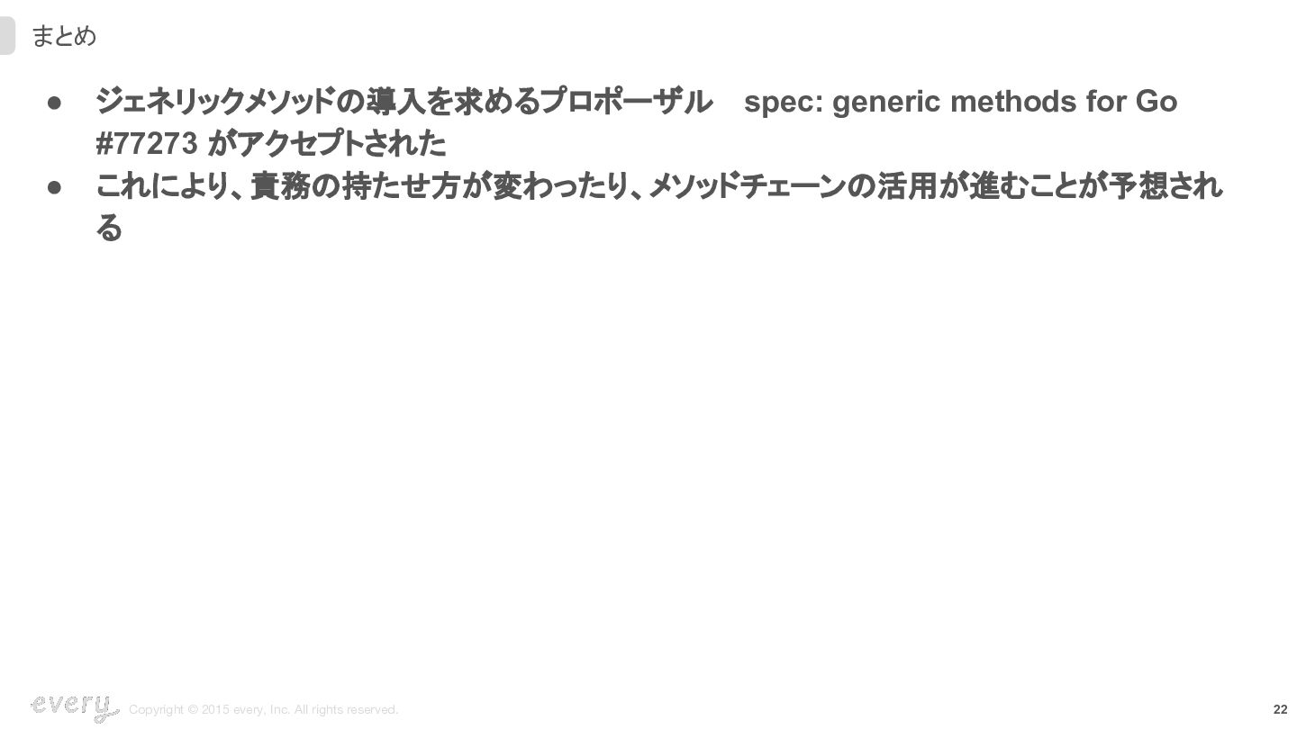 • ジェネリックメソッドの導入を求めるプロポーザル spec: generic methods for Go #77273 がアクセプトされた • これにより、責務の持たせ方が変わったり、メソッドチェーンの活用が進むことが予想され る